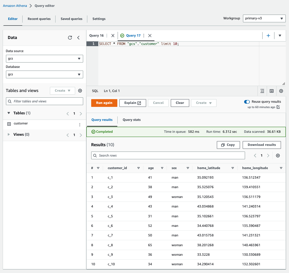 デプロイしたデータソースコネクタでクエリした結果は、以下のとおりです。GCS上のデータが、Amazon Athenaでも同じように表示されることを確認できました。