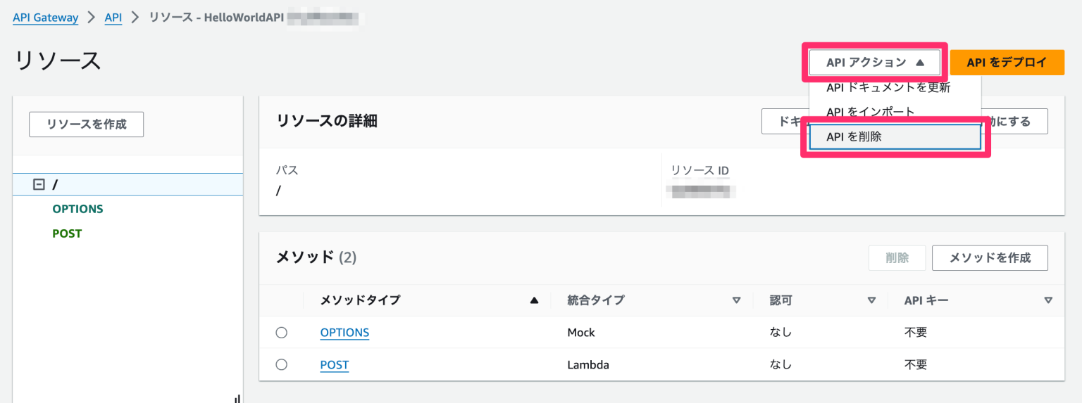 API Gatewayは右上「APIアクション -> APIを削除」から実行します。