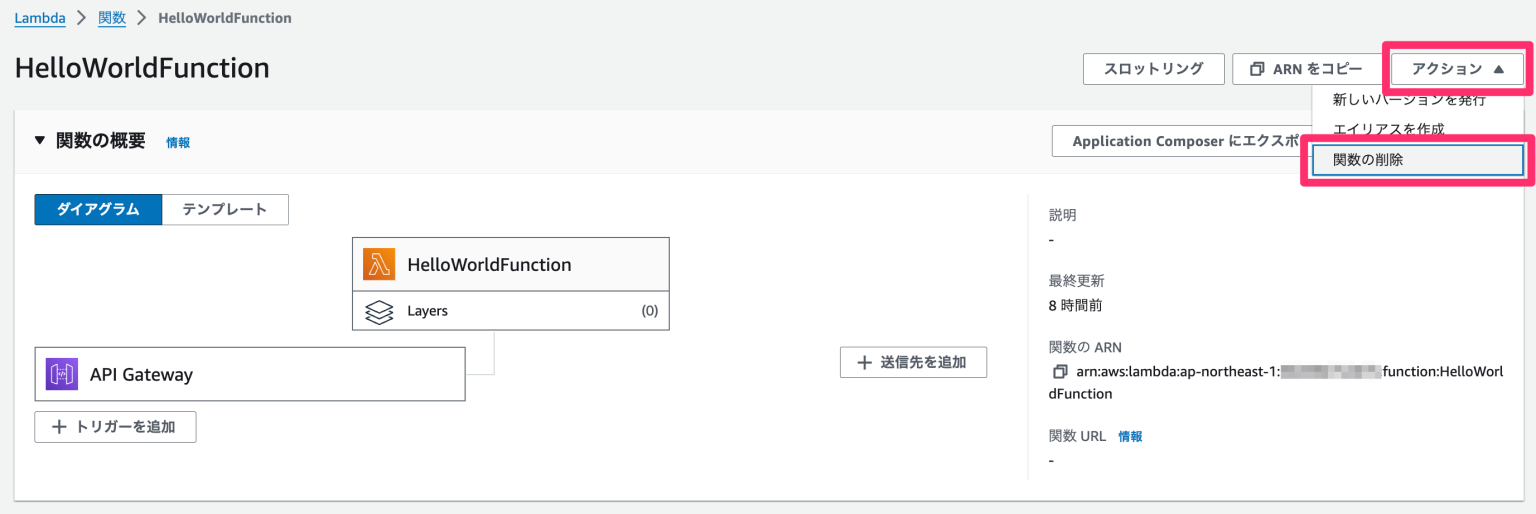 Lambda関数は右上「アクション -> 関数を削除」から実行します。