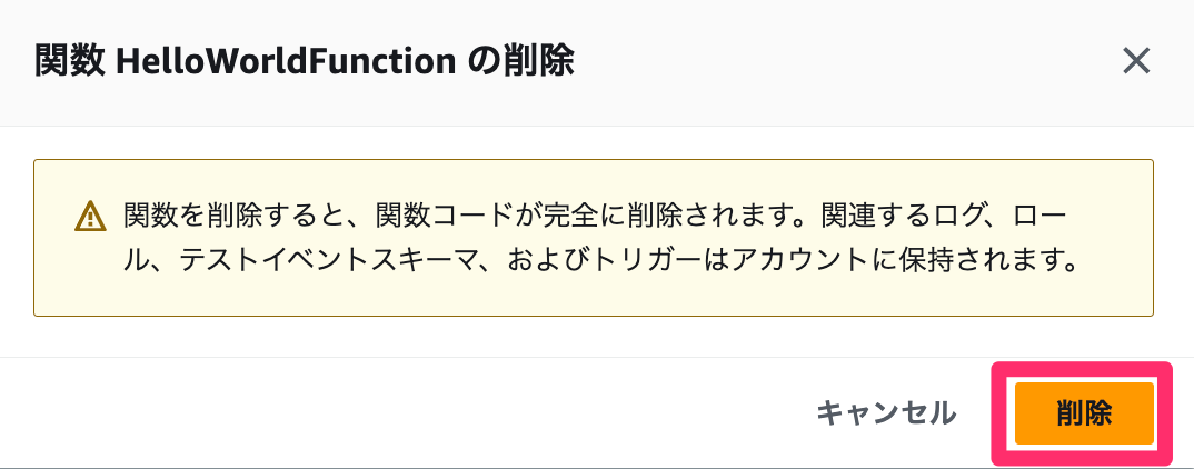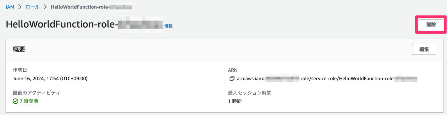 Lambda関数のIAM Roleは詳細画面右上「削除」から実行します。