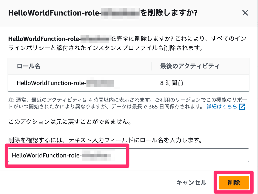 確認がでるのでIAM Role名を貼り付けて「削除」します。