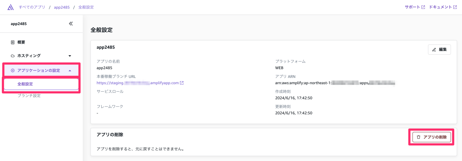 Amplifyアプリケーションは「アプリケーションの設定 -> 全般設定」の右下で「アプリの削除」します。