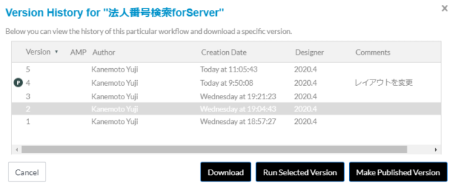 最新版以外を公開バージョンに設定できるため、ワークフローを公開しつつ、アップデートが可能です。