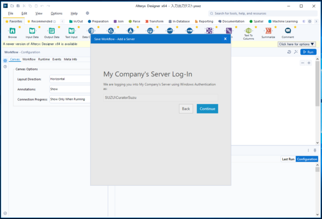 今度はAlteryx Serverに接続できました。ログインはActive Directoryのユーザーを使って自動的にログインされます。ユーザー名を確認して[Continue]をクリックすると保存画面に移動します。