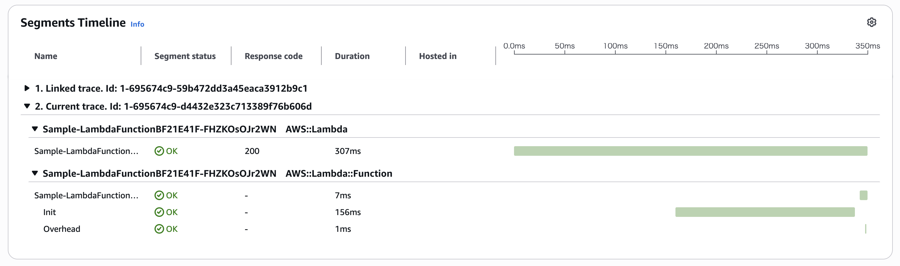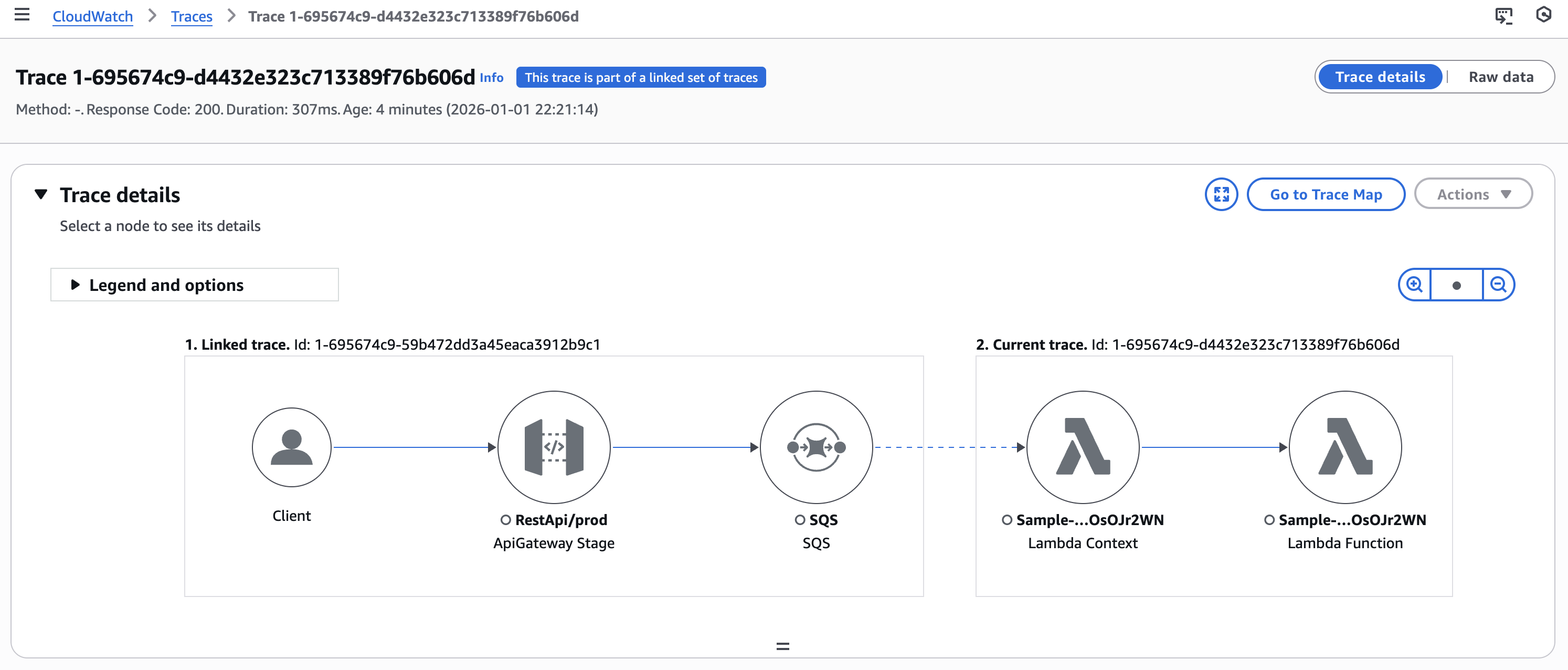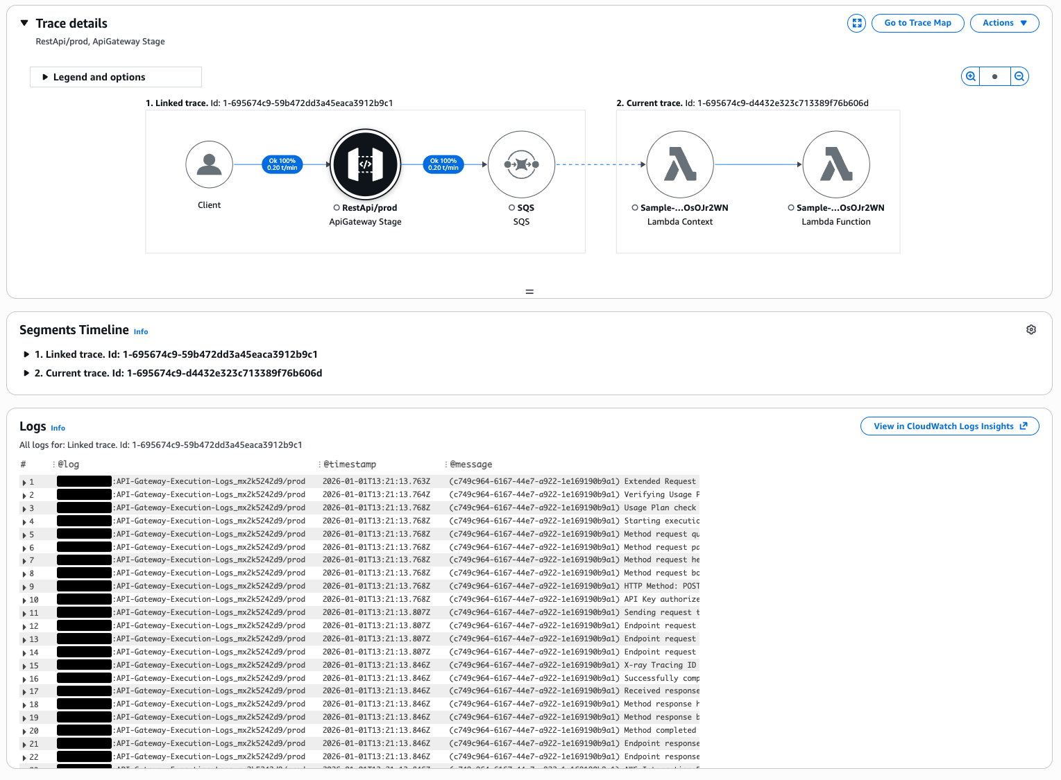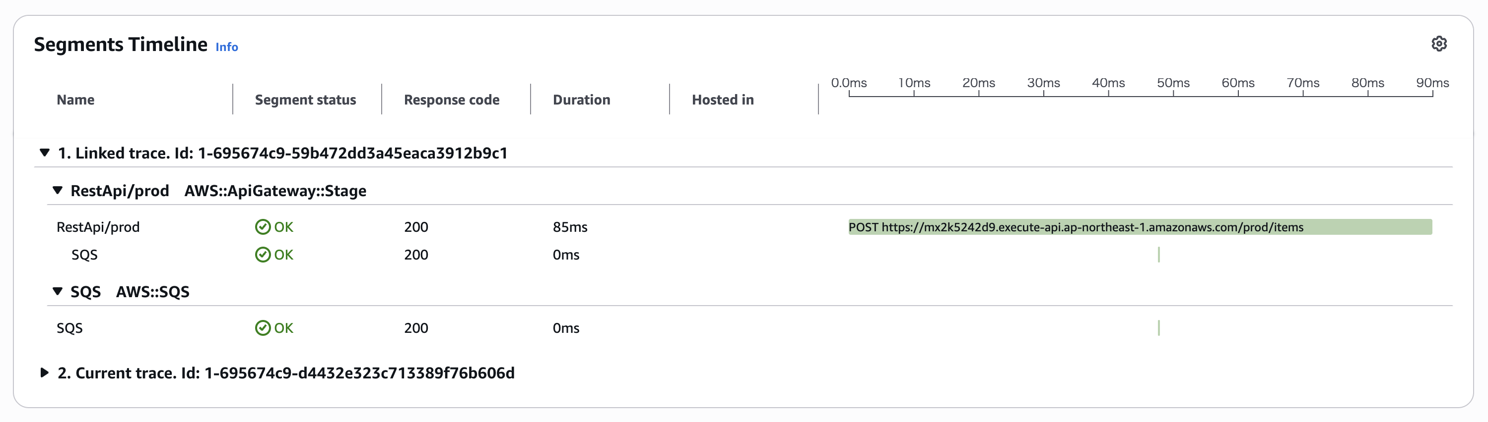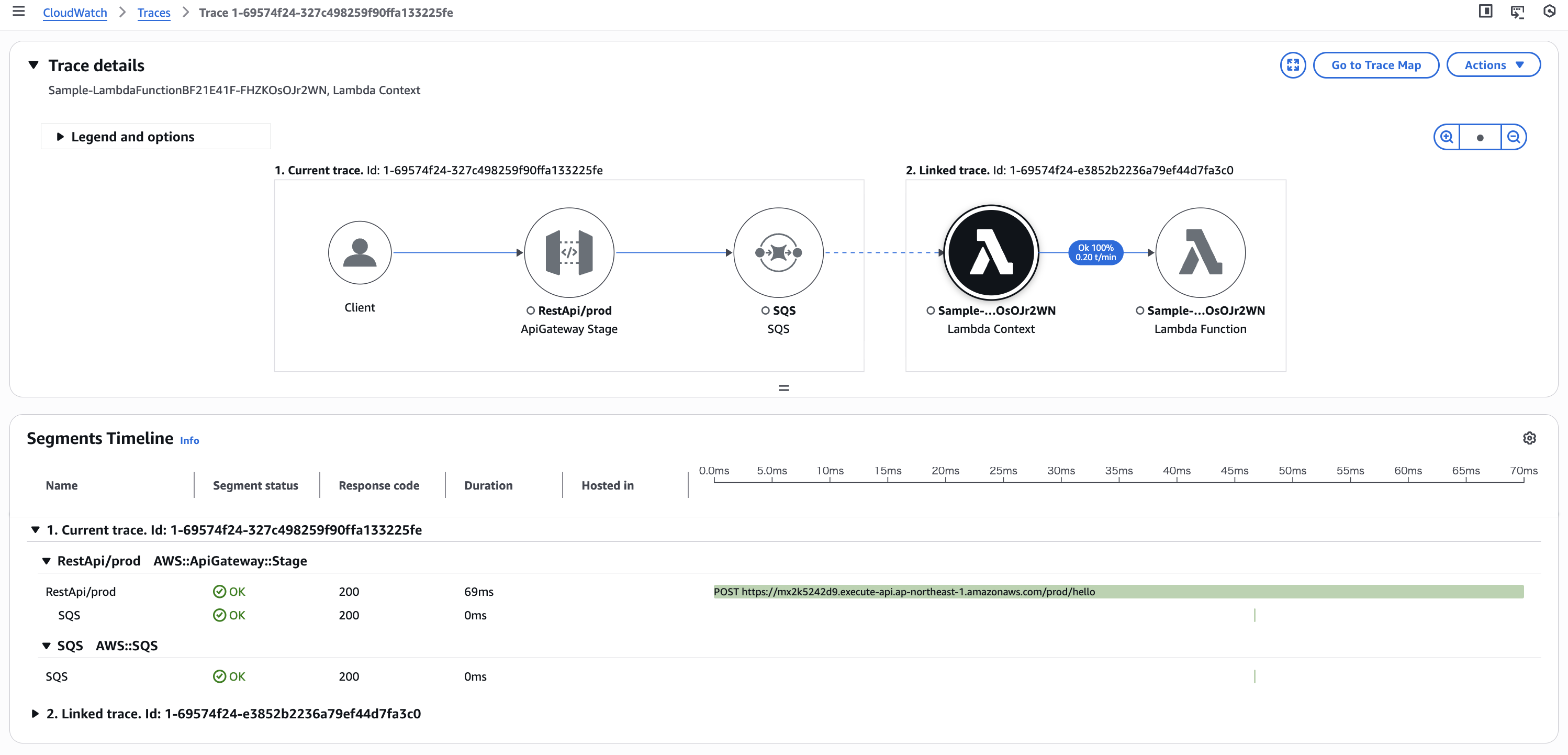実行結果のトレースです。SQS キューのアップストリームとダウンストリームの2つのトレースが接続され、単一のトレースかのようにで1つのページ上で確認可能となっています。