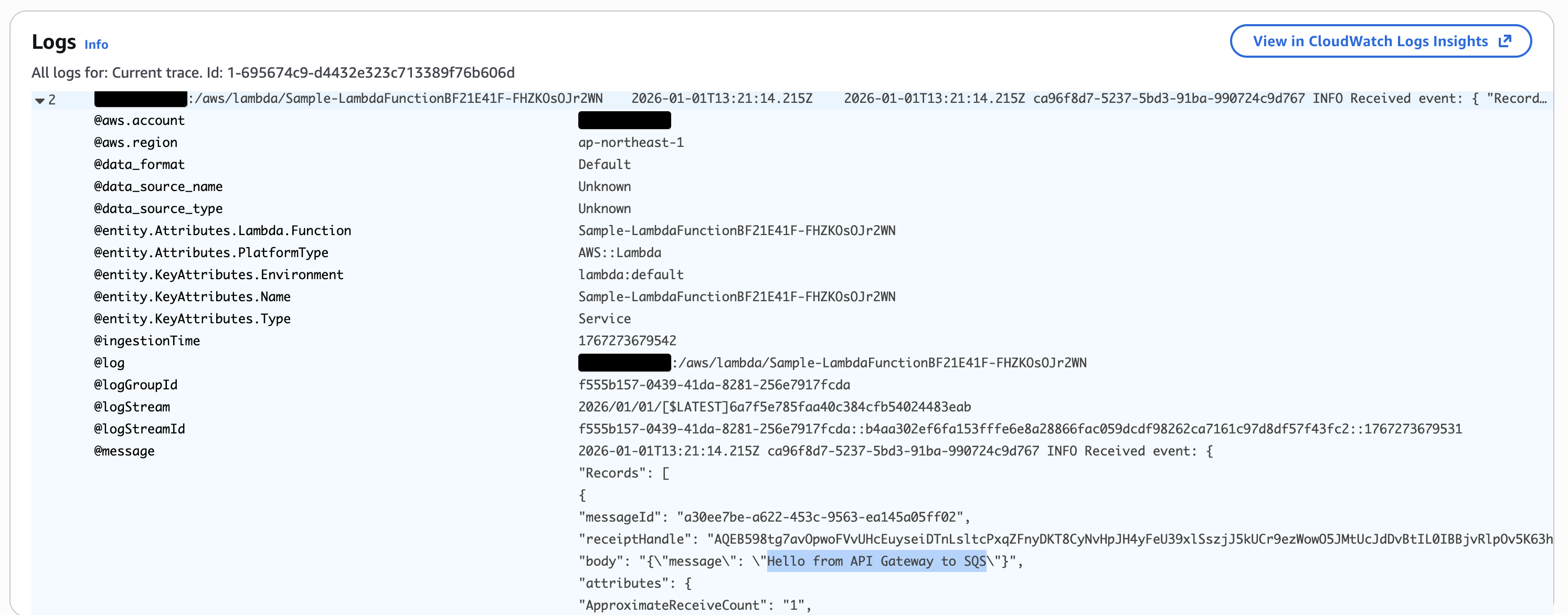 Lambda 関数のログを見ると、API 呼び出し時に渡されたメッセージが表示されており、キューを経由してペイロードが正しく渡されていることが確認できます。