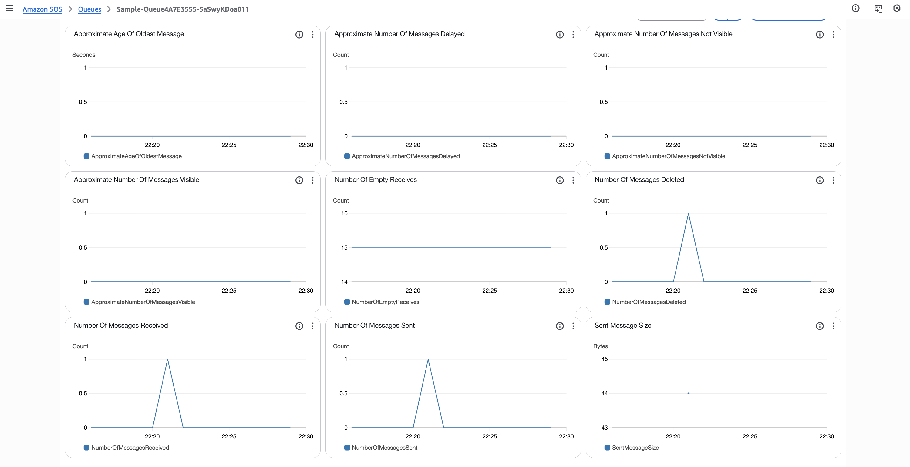 SQS キューのメトリクスです。1件のメッセージが送受信されていることが確認できます。