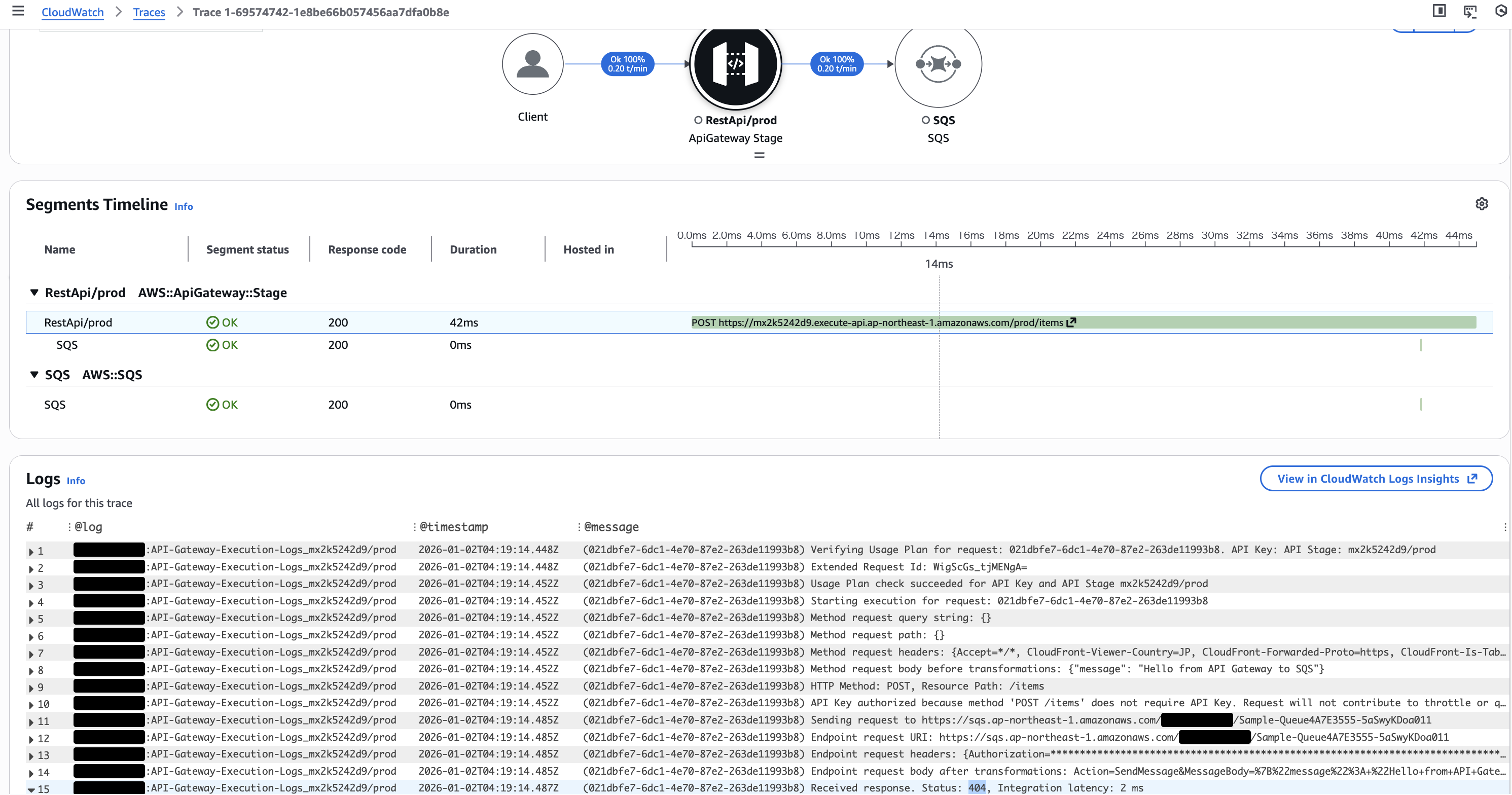 経由するサービスが増えているため当然ではありますが、SQS キューを介在させることで、直接 API Gateway から Lambda 関数を呼び出す場合と比較してレイテンシーが増加します。