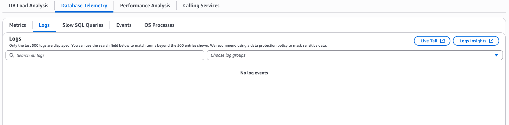 すると、CloudWatch の Database Insights ダッシュボードでスロークエリ情報および CloudWatch Logs 出力が確認できるようになりました。
