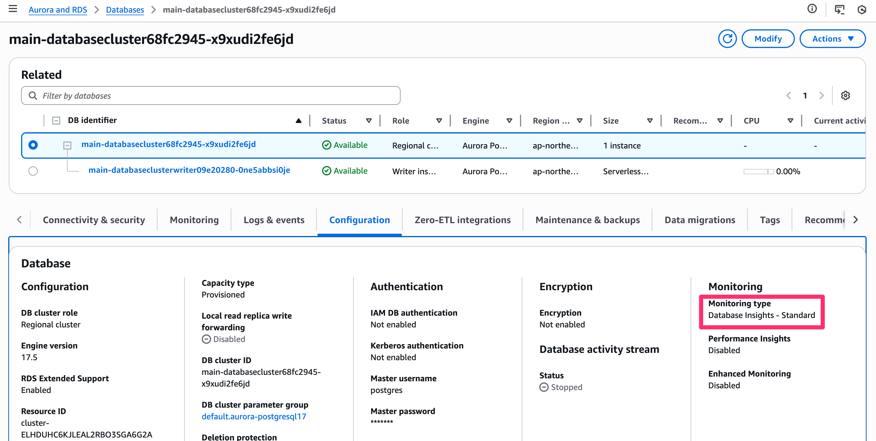 上記をデプロイ後、クラスターの設定を確認すると、Database Insights のスタンダードモードが有効化されていることがわかります。