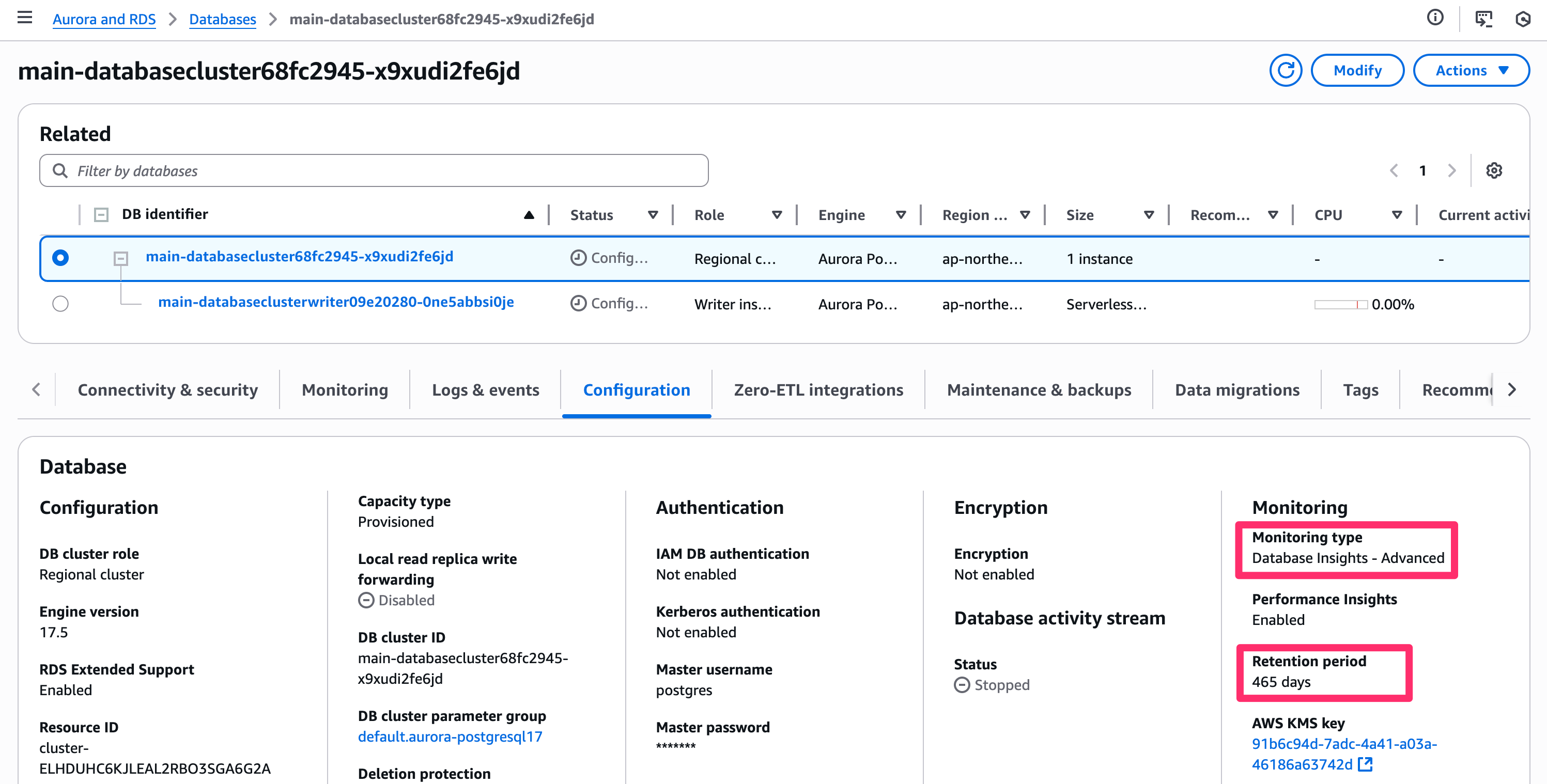 デプロイ後にクラスターの設定を確認すると、Database Insights のアドバンスドモードが有効化されていることがわかります。保持期限も 15 ヶ月間となっています。加えて、Performance Insights も有効化されていますね。