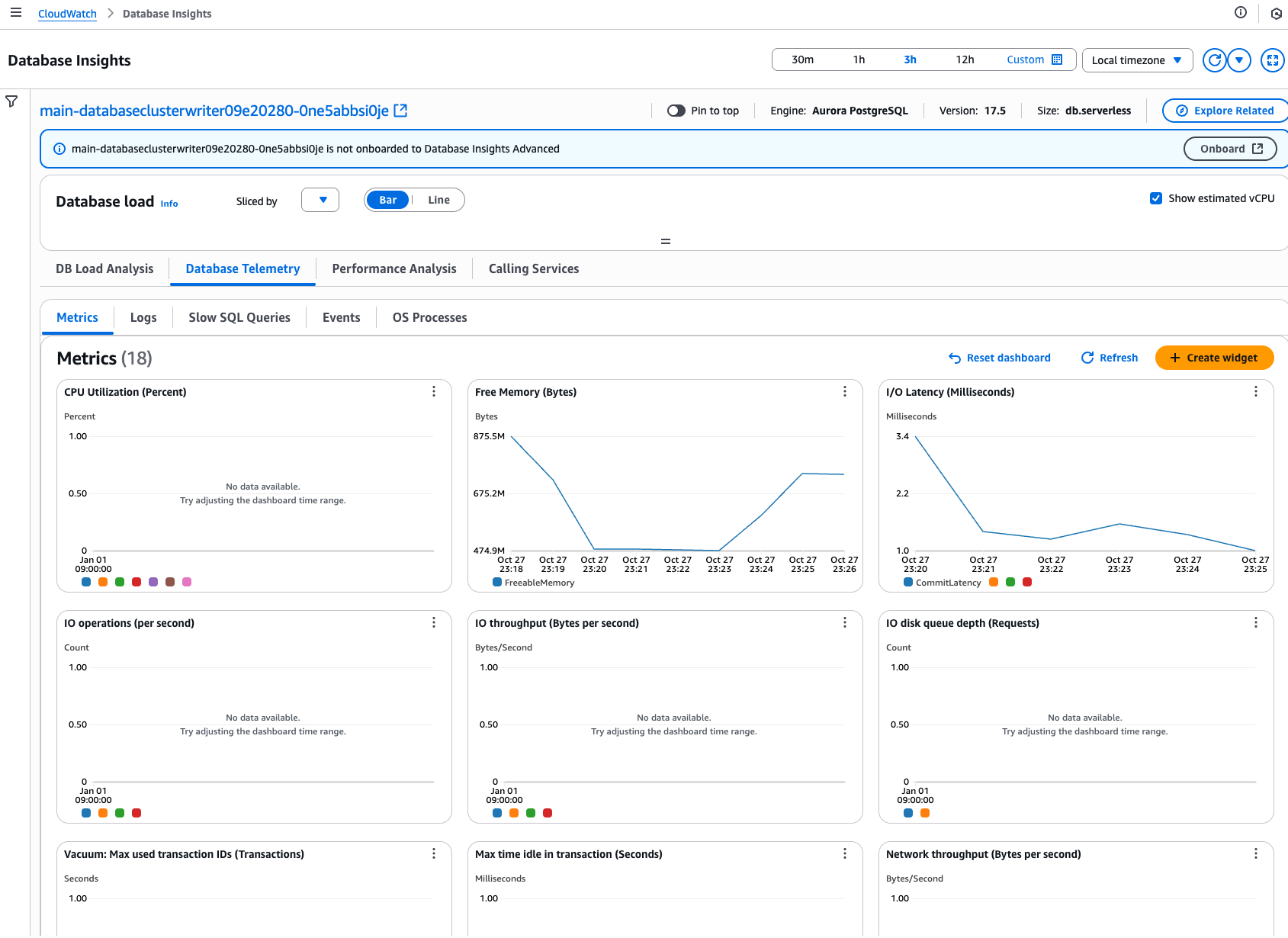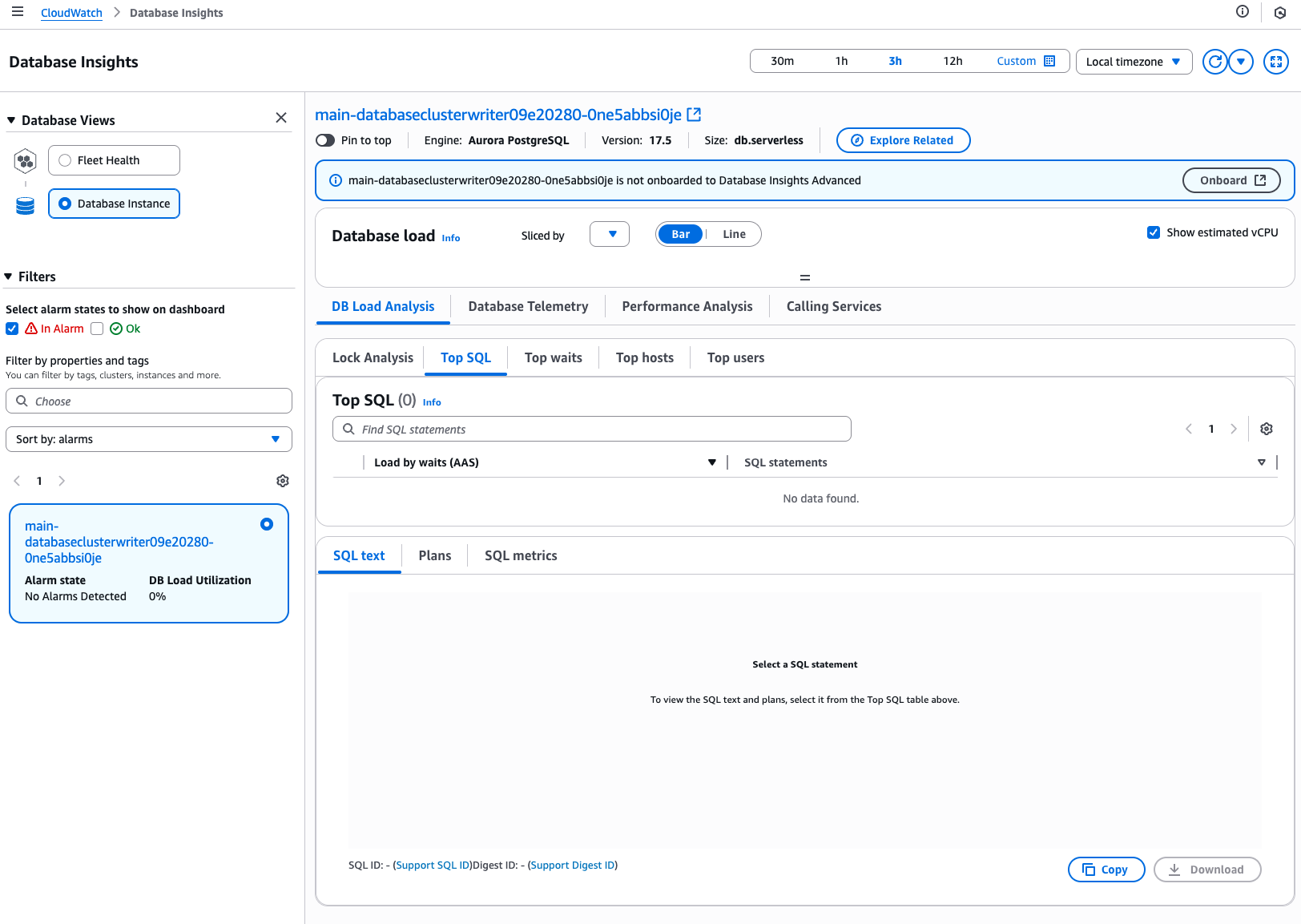 Database Insights ダッシュボードを確認すると、アドバンスドモードへの切り替えを促すメッセージが表示されなくなっています。