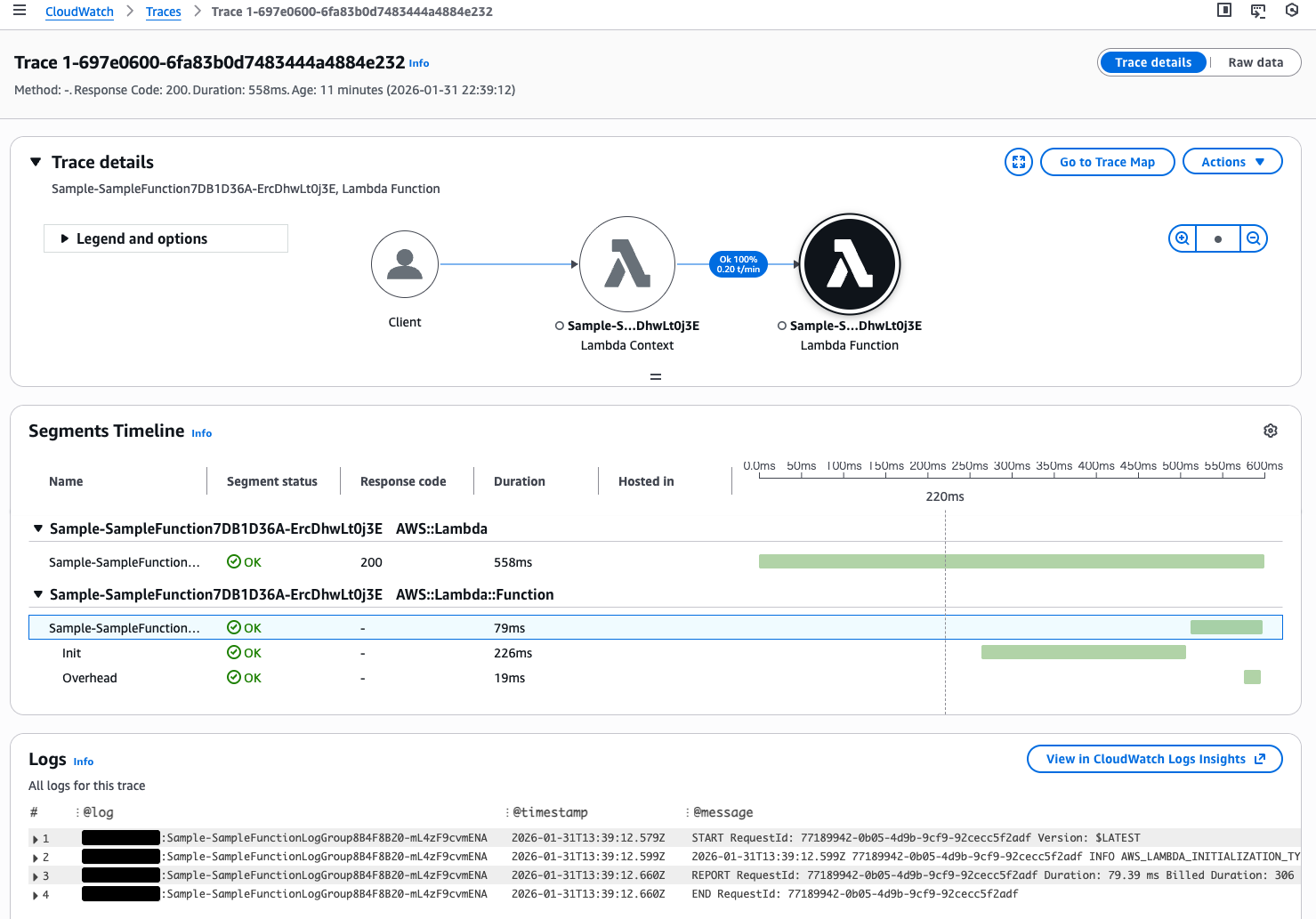 参考までに、X-Ray トレース上ではサービスマップもログも確認できました。