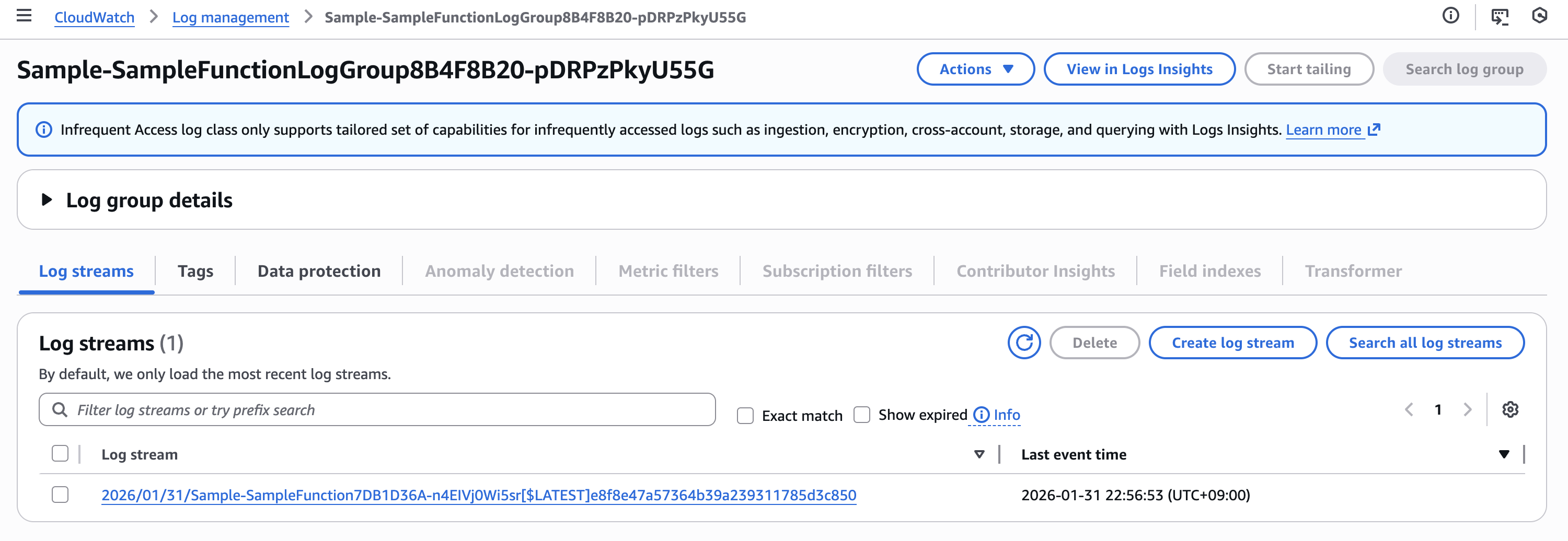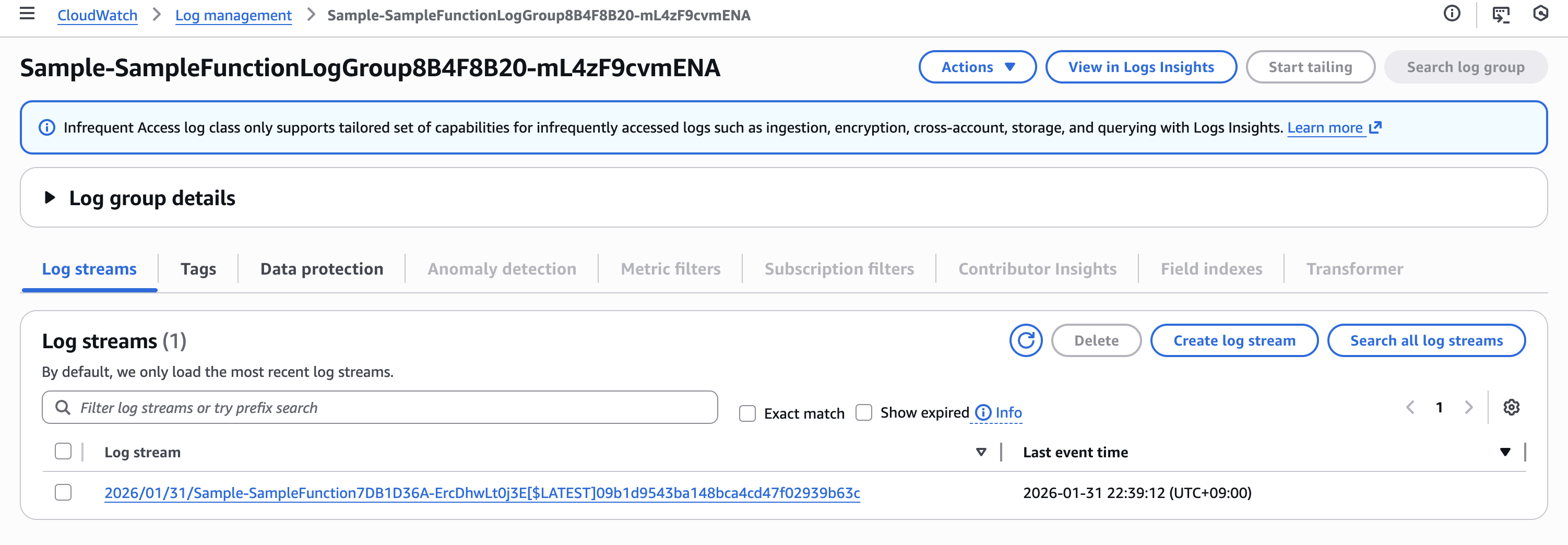 まずは、Lambda 関数本体と Lambda Insights 用ロググループのいずれも IA ログクラスに設定した場合です。