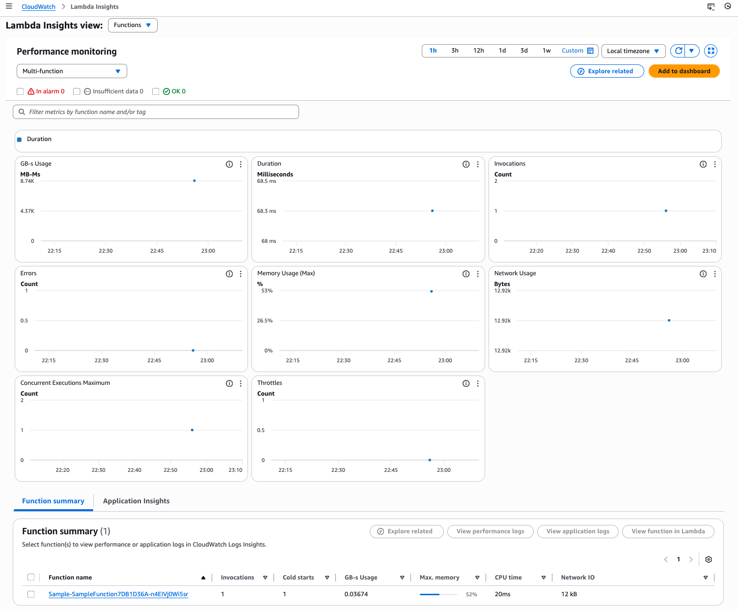 Lambda Insights の関数横断のページでも同様にメトリクスおよび関数ごとのサマリーが確認できました。