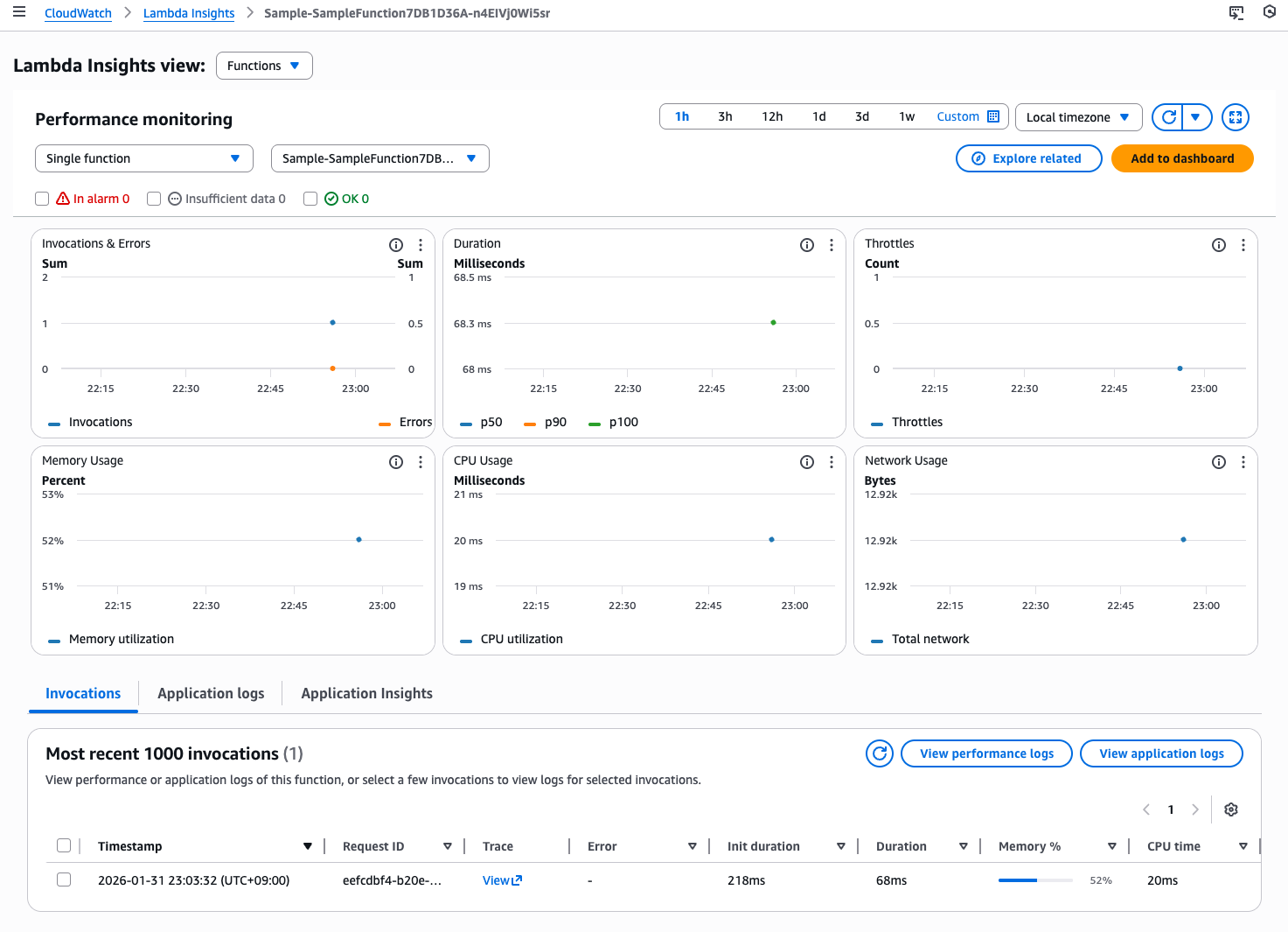 そして Lambda Insights のコンソール画面では、実行もメトリクスも確認できました。