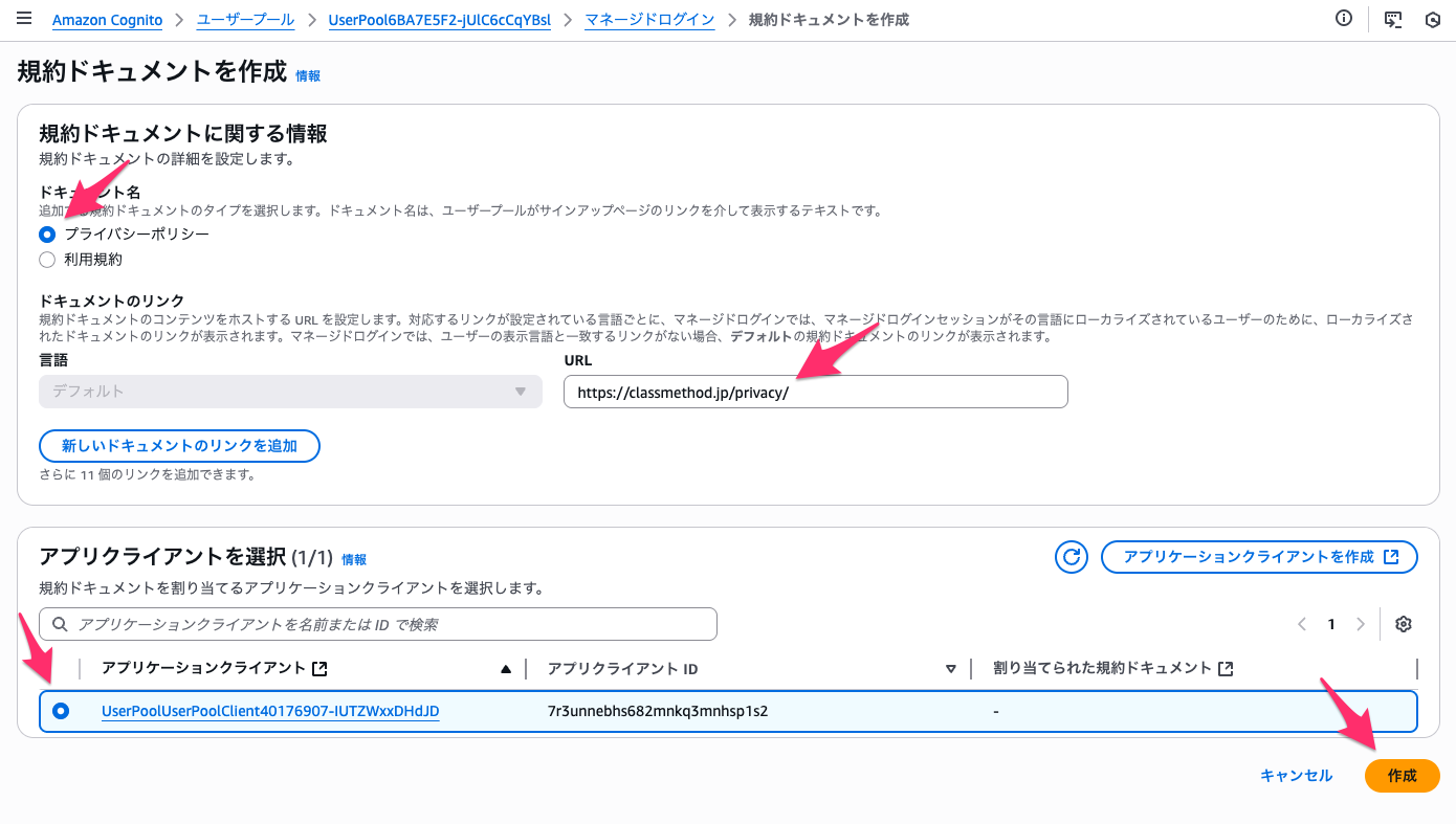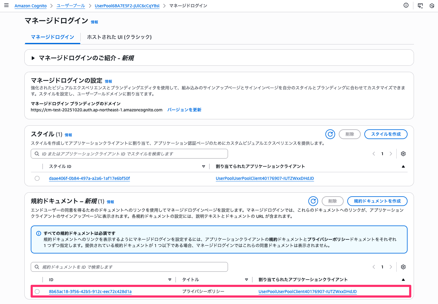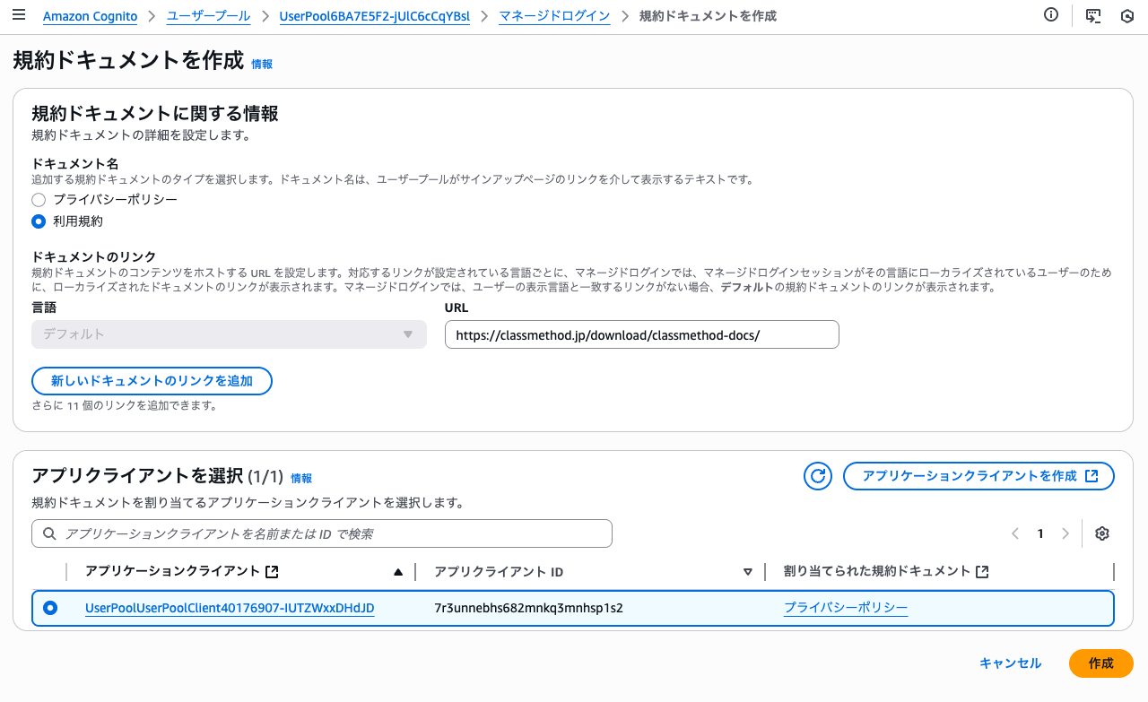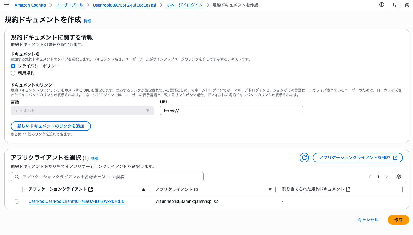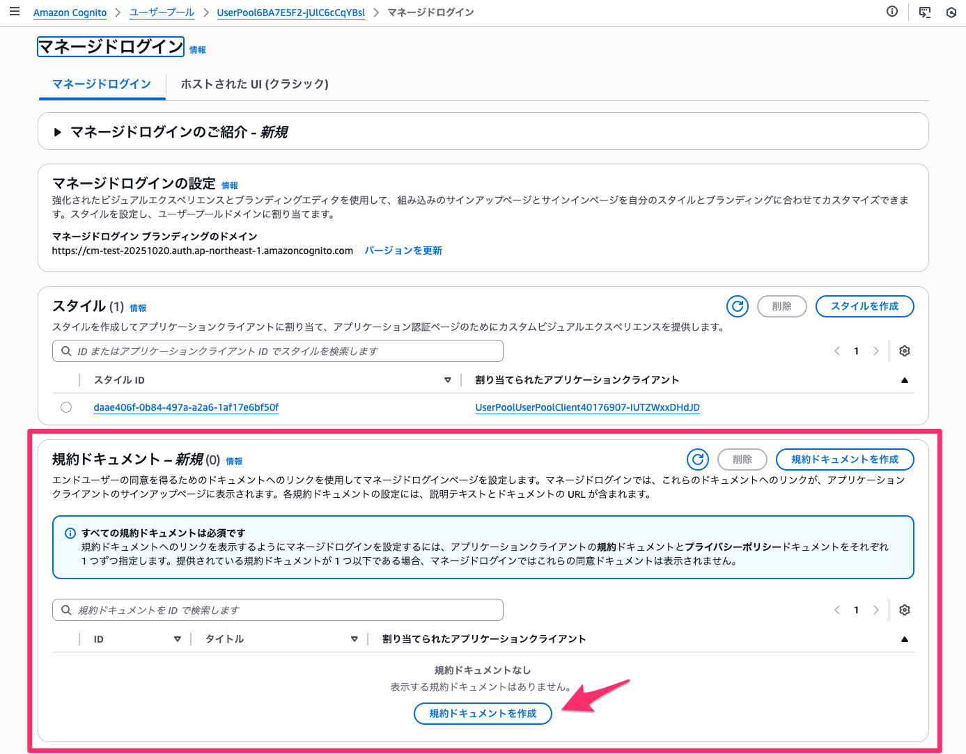 ユーザープールのマネージドログイン設定画面を開くと、今回のアップデートでプライバシーポリシーと利用規約の設定セクションが追加されています。[追加ドキュメントを作成] ボタンをクリックします。