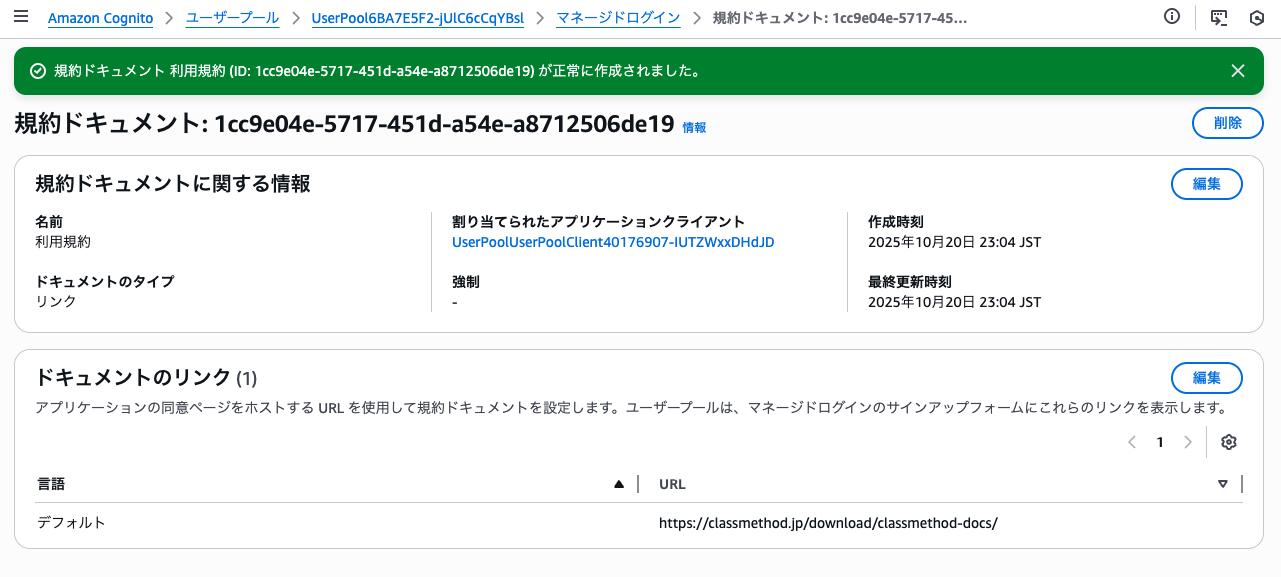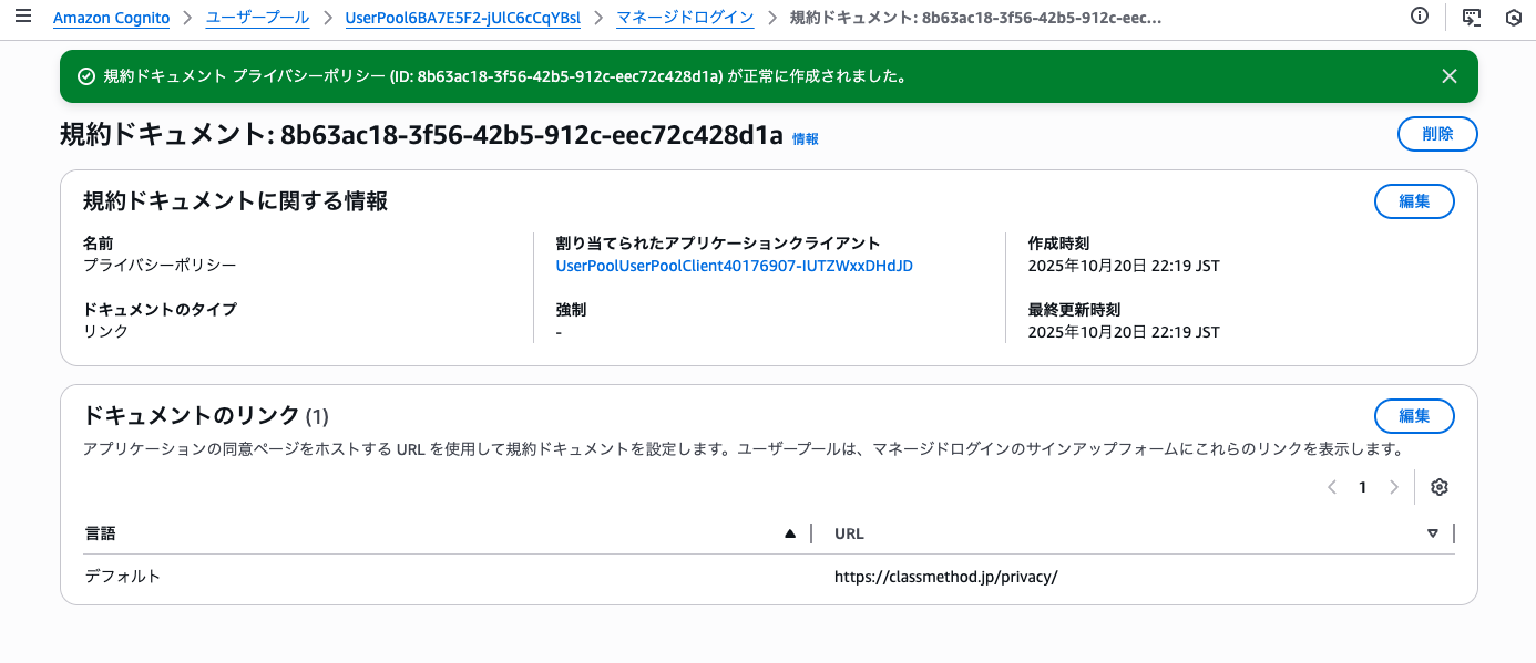 Amazon Cognito のマネージドログインに「プライバシーポリシー」と「利用規約」を設定可能となるアップデートがあったのでご紹介しました。