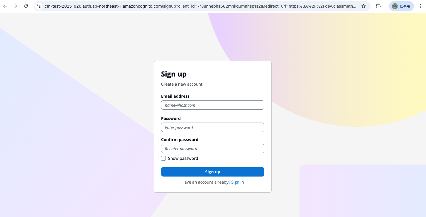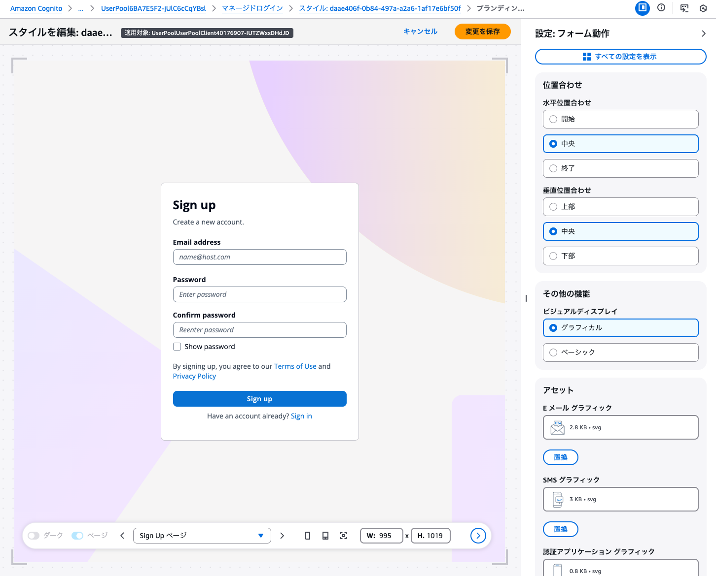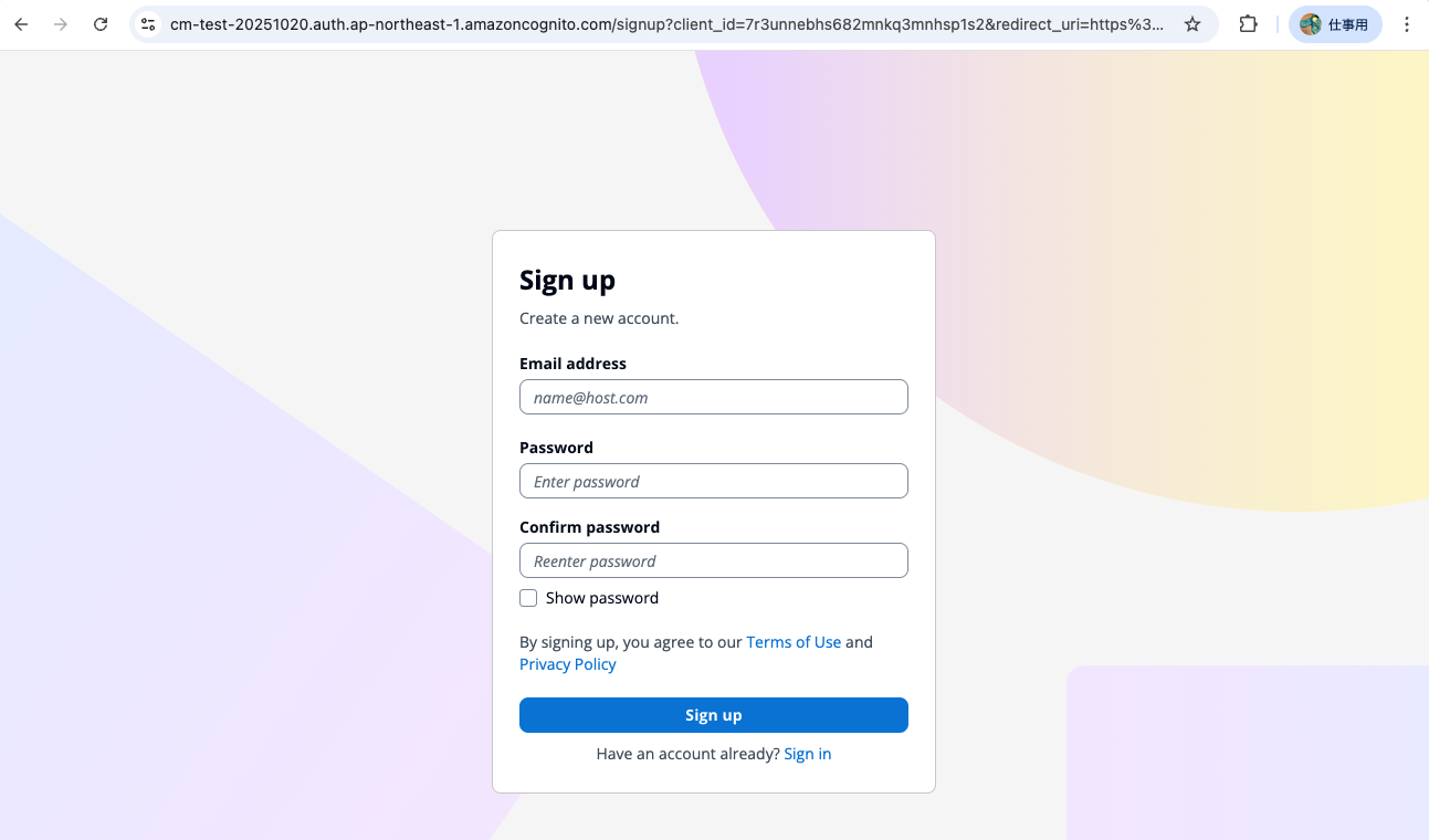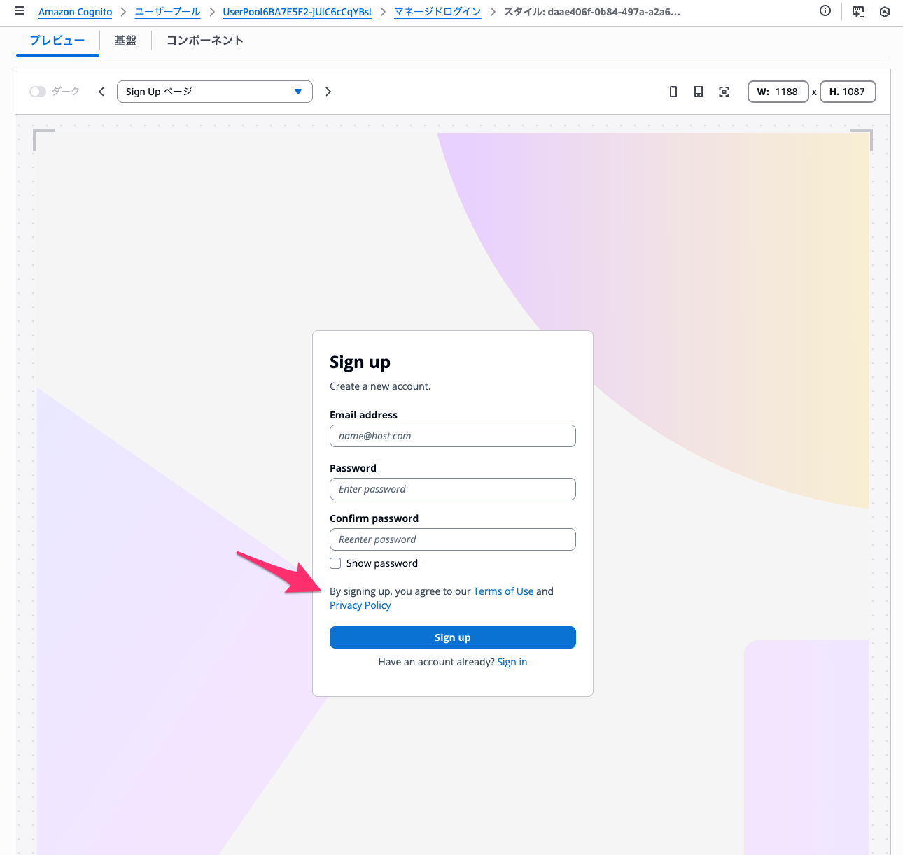 マネージドログインのプレビューを確認すると、サインアップ画面に利用規約とプライバシーポリシーへのリンクが表示されるようになりました。