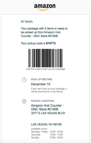 今回の場合は、11/26にAmazon Hub Counterに届けられ、12/10までに受け取ればOKでした。