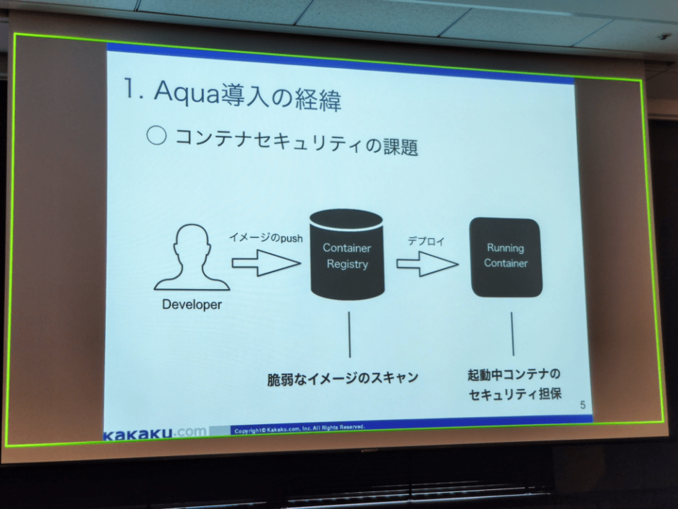 コンテナセキュリティの課題として、一番良く知られているのが脆弱なイメージのスキャンもあります。最近ここを機能提供しているパブリッククラウドも複数ありますが、この脆弱性スキャンをすり抜けて運用環境にデプロイされるコンテナもゼロとは言えません。Aquaは、この起動中コンテナをセキュリティ担保できる非常に貴重な製品で、これが導入の決め手となりました。