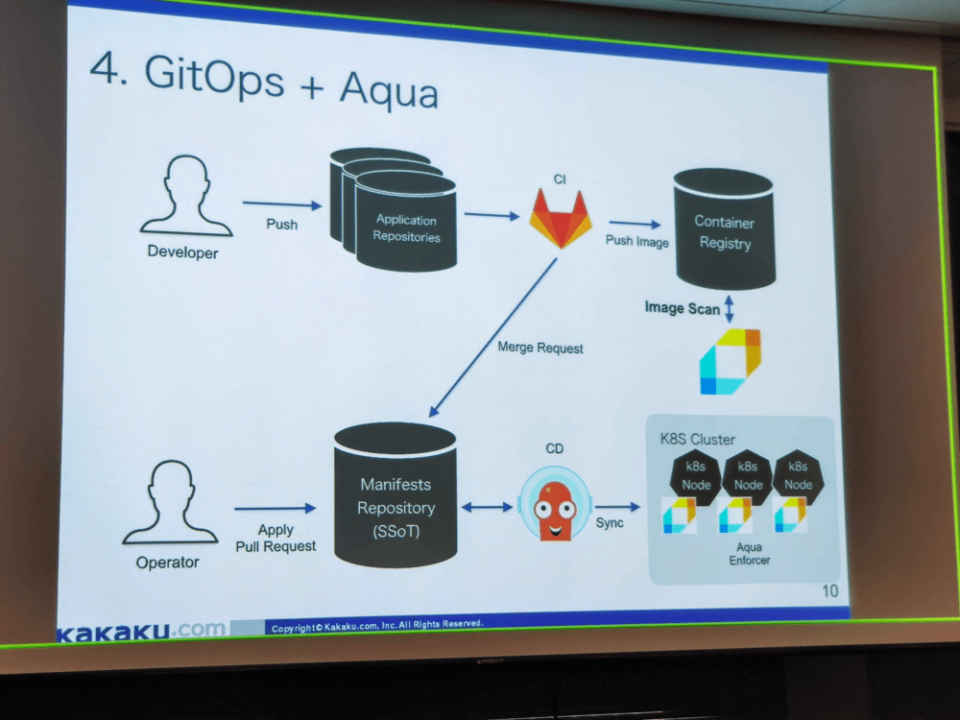 基本は、弊社でも扱っているAqua Container Securityについての話が主だったのですが、製品仕様以外にもカカクコム様でのKubernetes運用のGitOpsの話であったり、決済サービスPaidyにおけるコンテナ運用の話であったり、最近話題のOSSな脆弱性スキャンツールのTrivyの作者、福田さんがイスラエルからオンラインセミナーやったり、コンテナ界隈の幅広い話題がてんこ盛りで、楽しい一日でした。