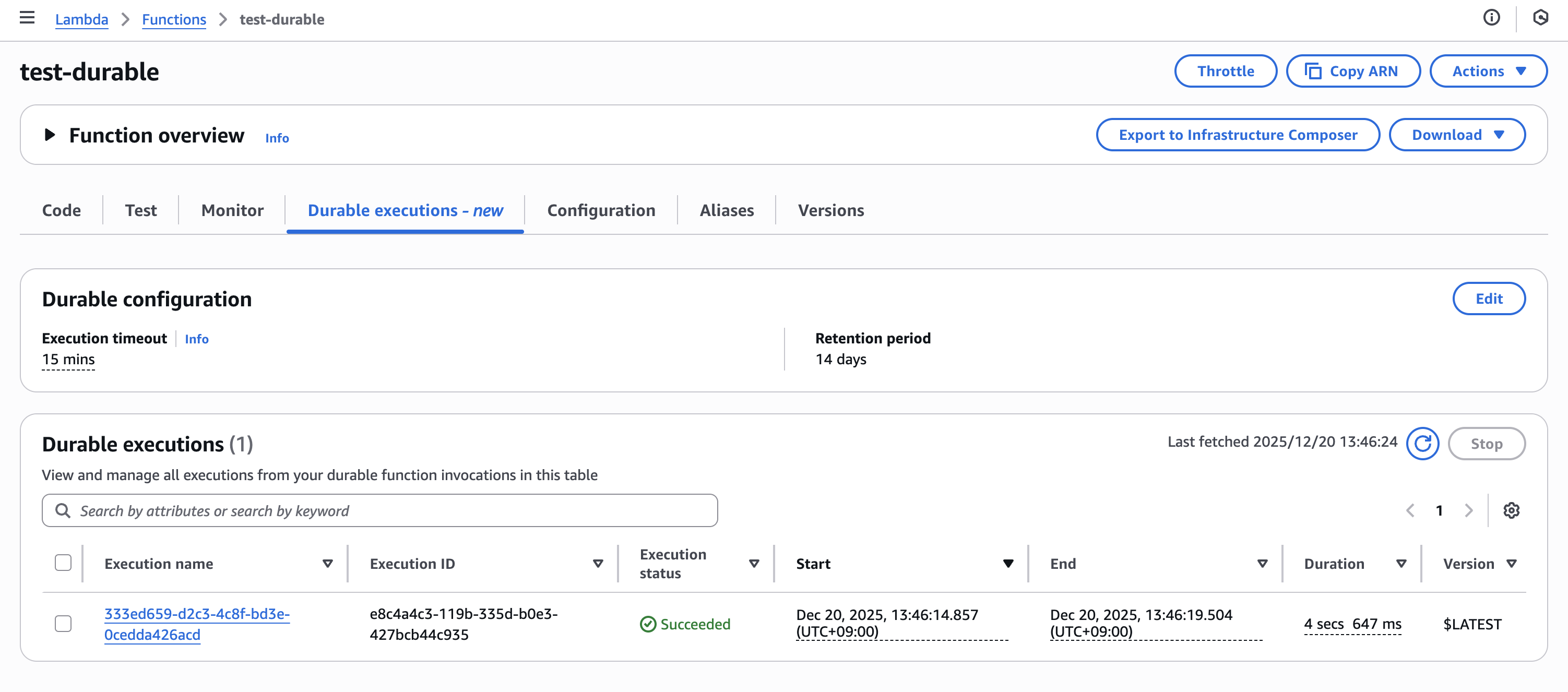 "FunctionArn": "arn:aws:lambda:ap-northeast-1:XXXXXXXXXXXX:function:test-durable:$LATEST",
