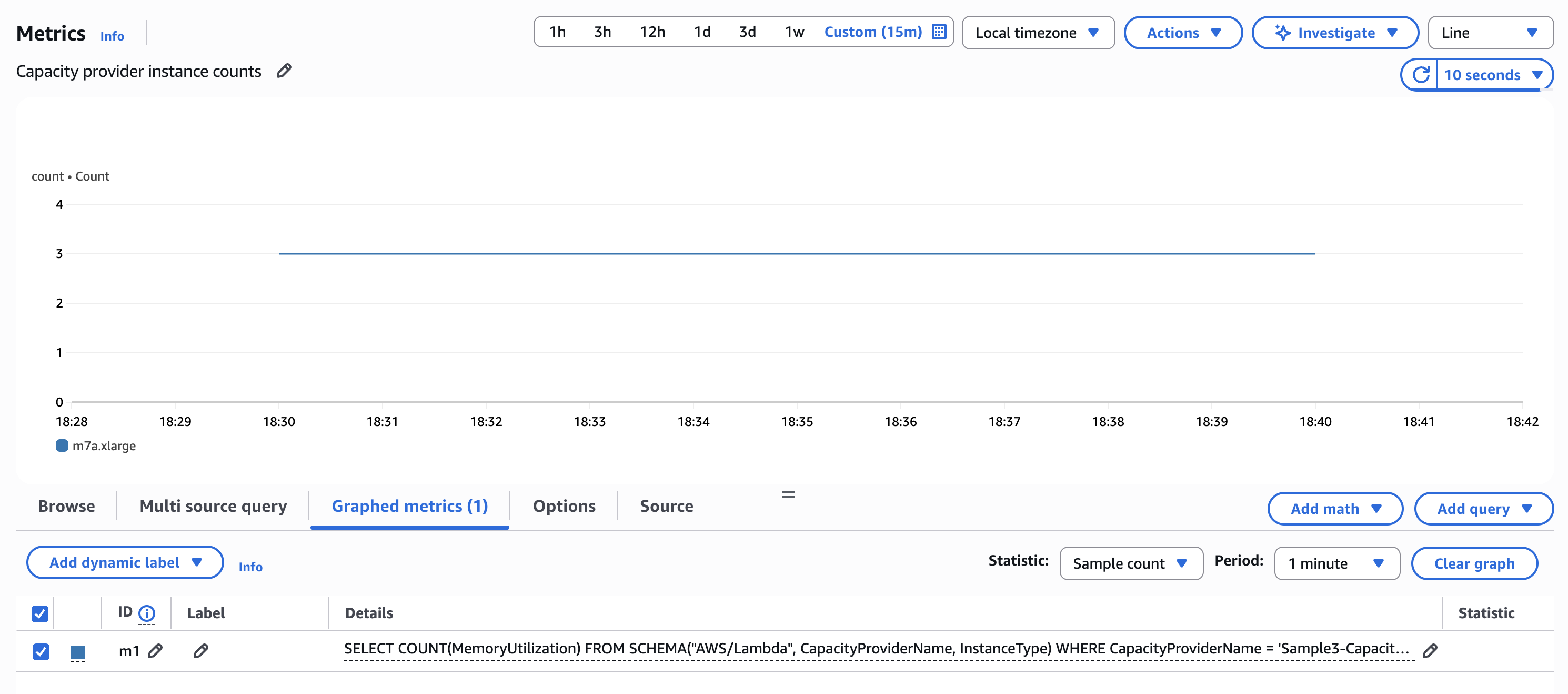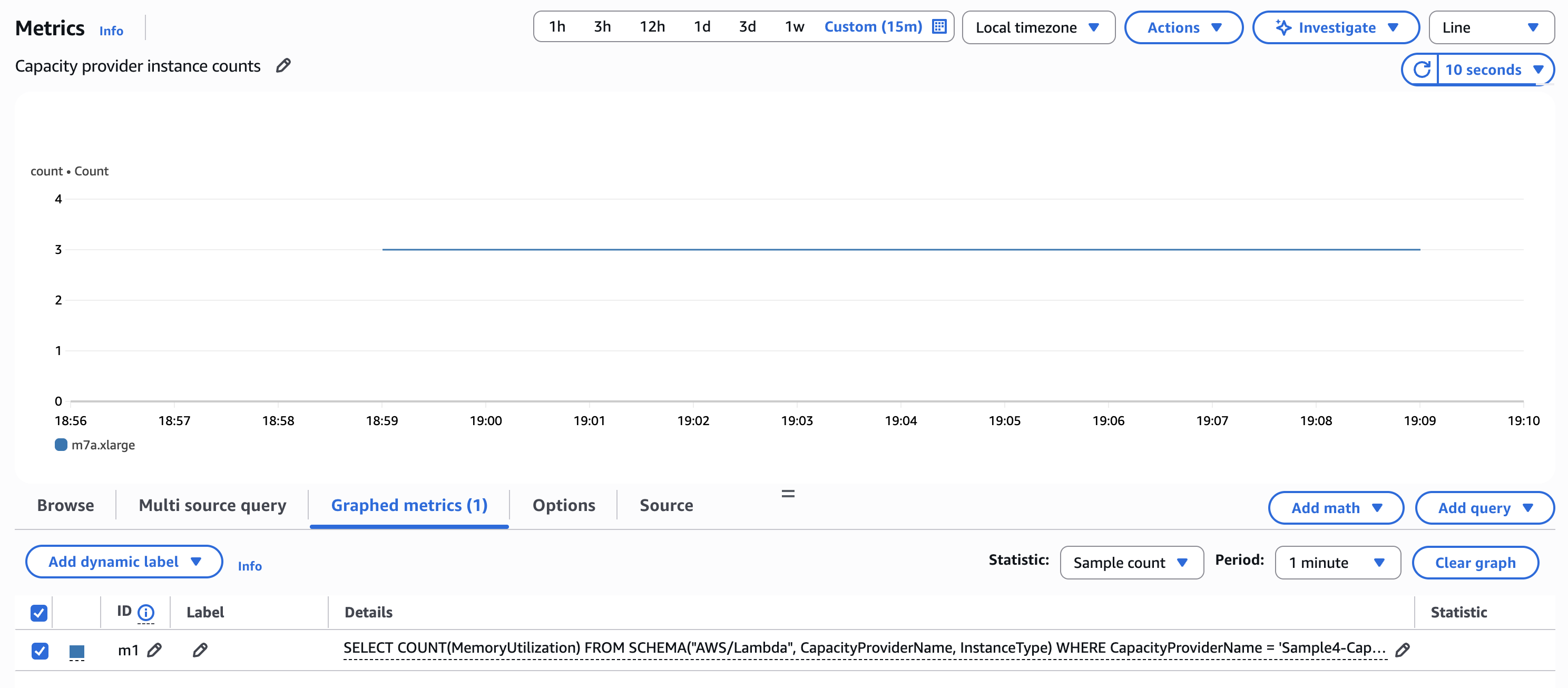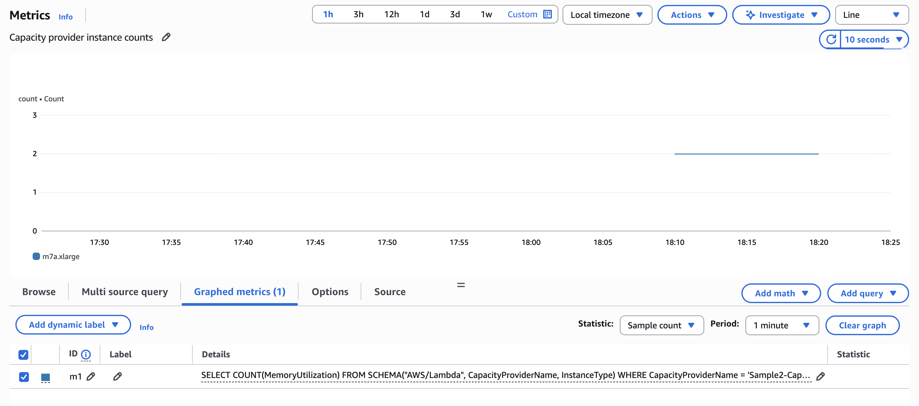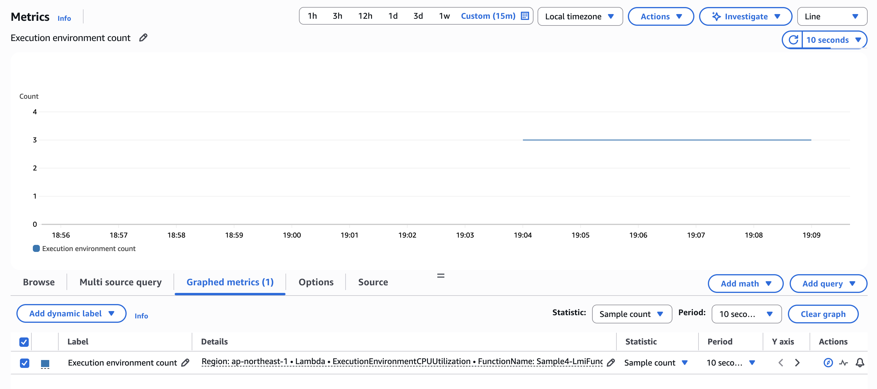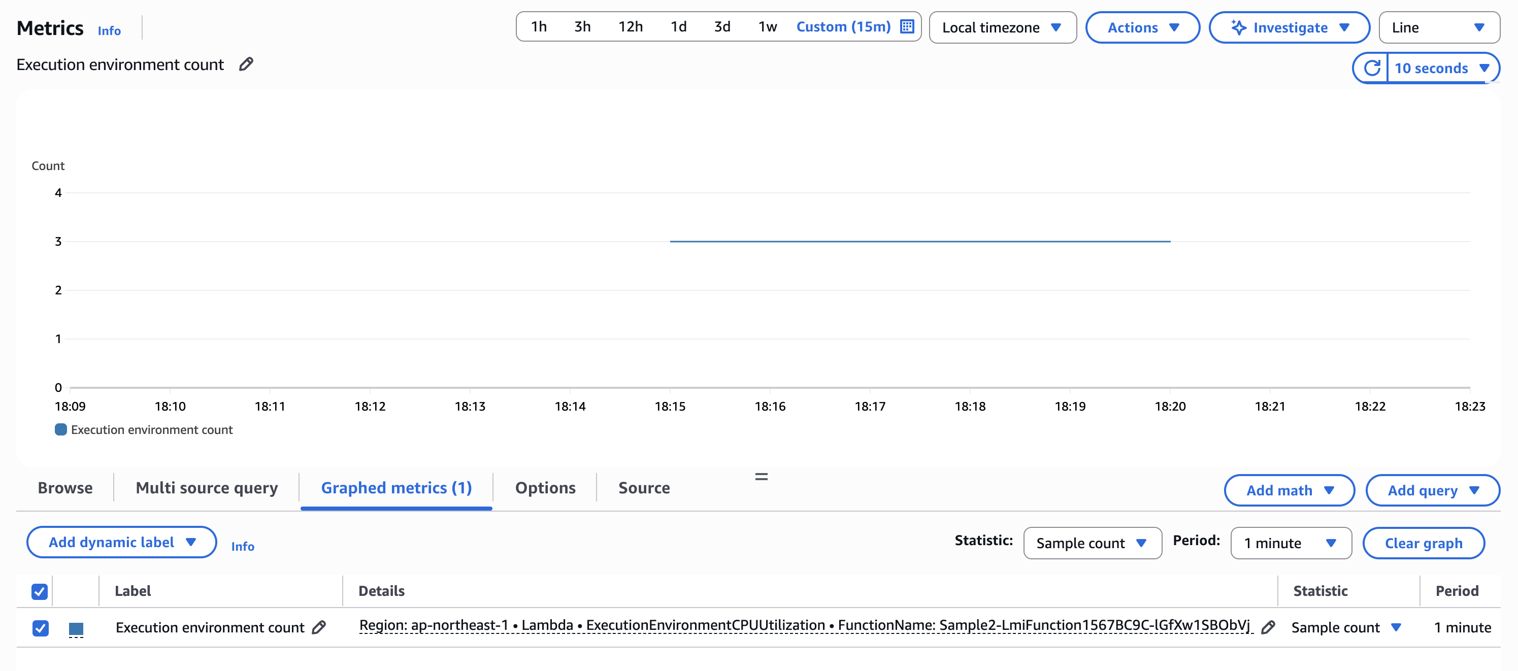 上記のデプロイにより構築した各スタックの「Capacity provider instance counts」および「Execution environment count」のメトリクスを AWS CloudWatch コンソールで確認します。