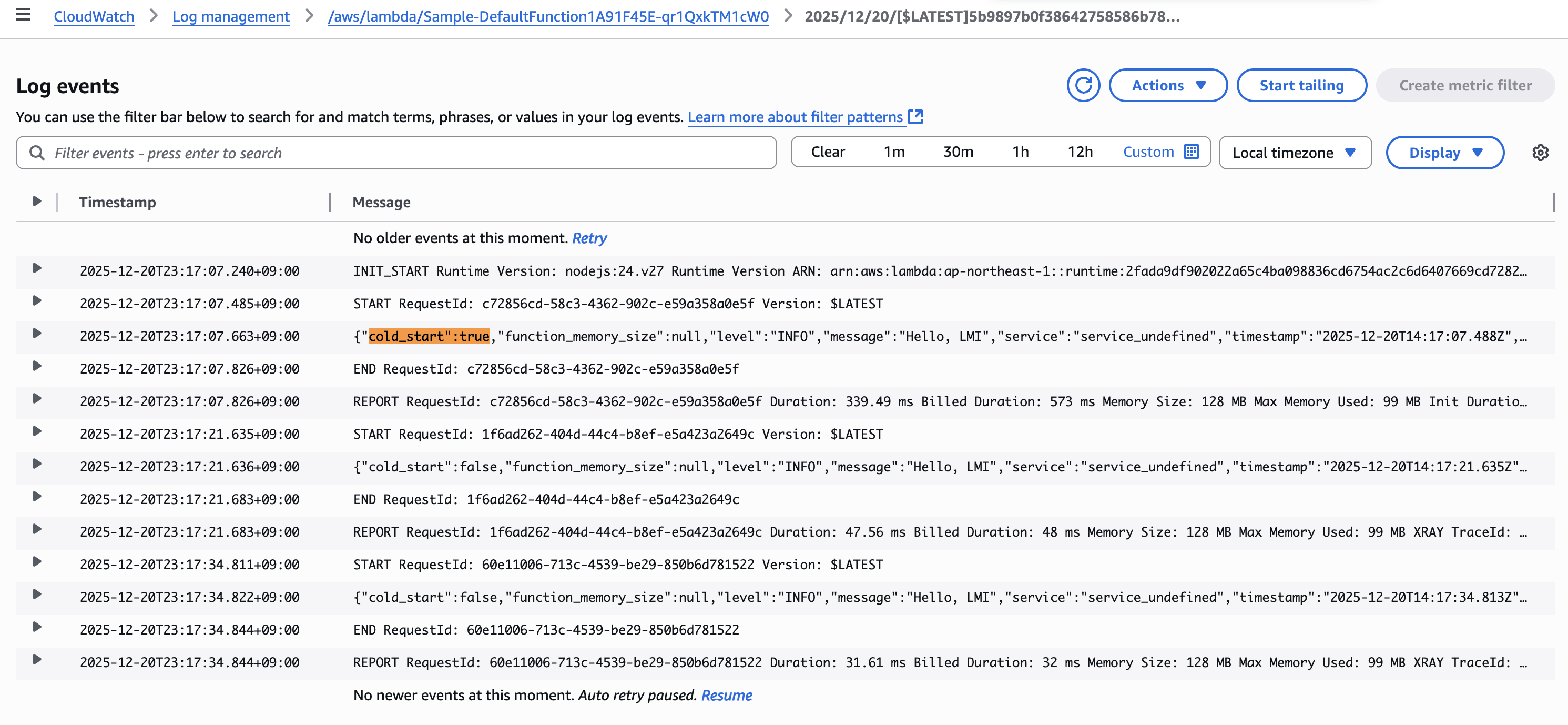 一方で、同じコードで LMI を実行した場合は、1 回目から 3 回目まで全て cold_start":true が出力されてしまいます。