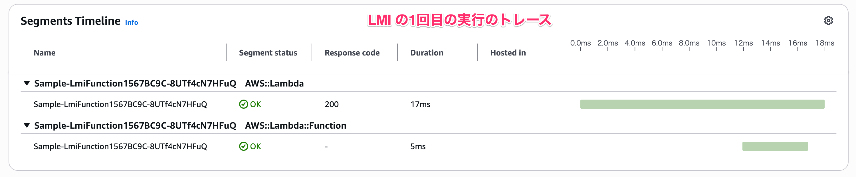 一方で LMI では 1 回目の実行でも Init フェーズが発生が無く、コールドスタートは発生していません。