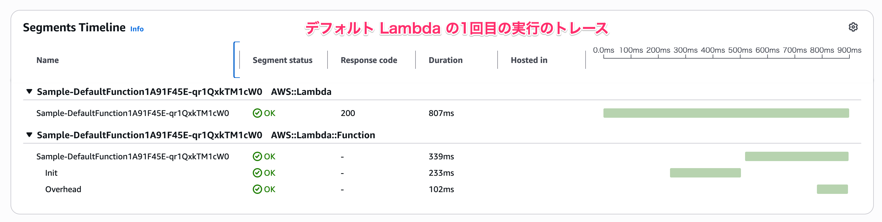 X-Ray のトレースを確認したところ、デフォルト Lambda では 1 回目の実行で Init フェーズが記録されており、やはりコールドスタートが発生していることがわかります。