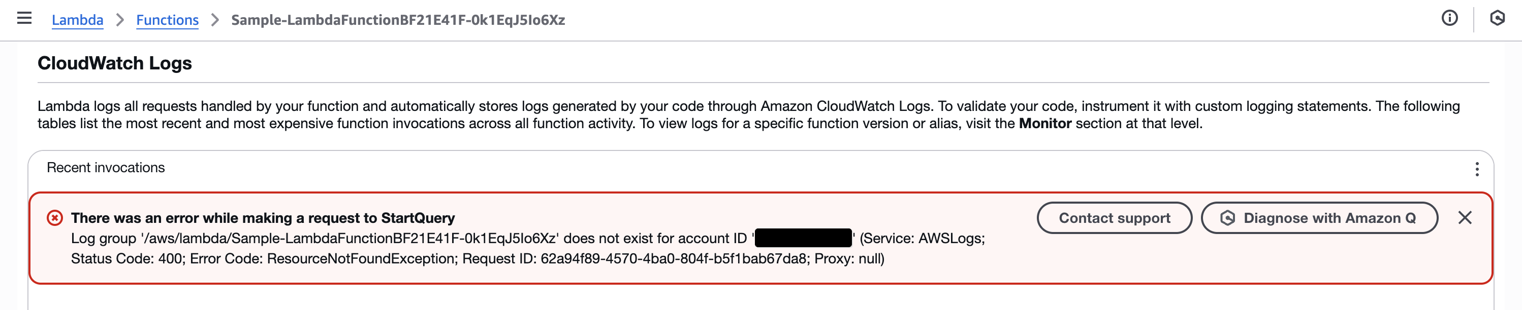 ネットワーク経路が確保されていない場合は、下記のように CloudWatch Logs のイベントログが作成されないなどが起きえるので注意しましょう。