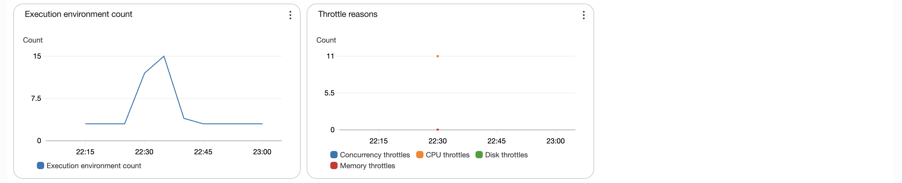 また CPU 使用率が 40% 未満に留まっているにも関わらずスロットルが発生したのは、実行環境ごとに割り当てられる vCPU 数が限られており、新しい実行環境のスケールアウトが追いつかなかったためと推測されます。