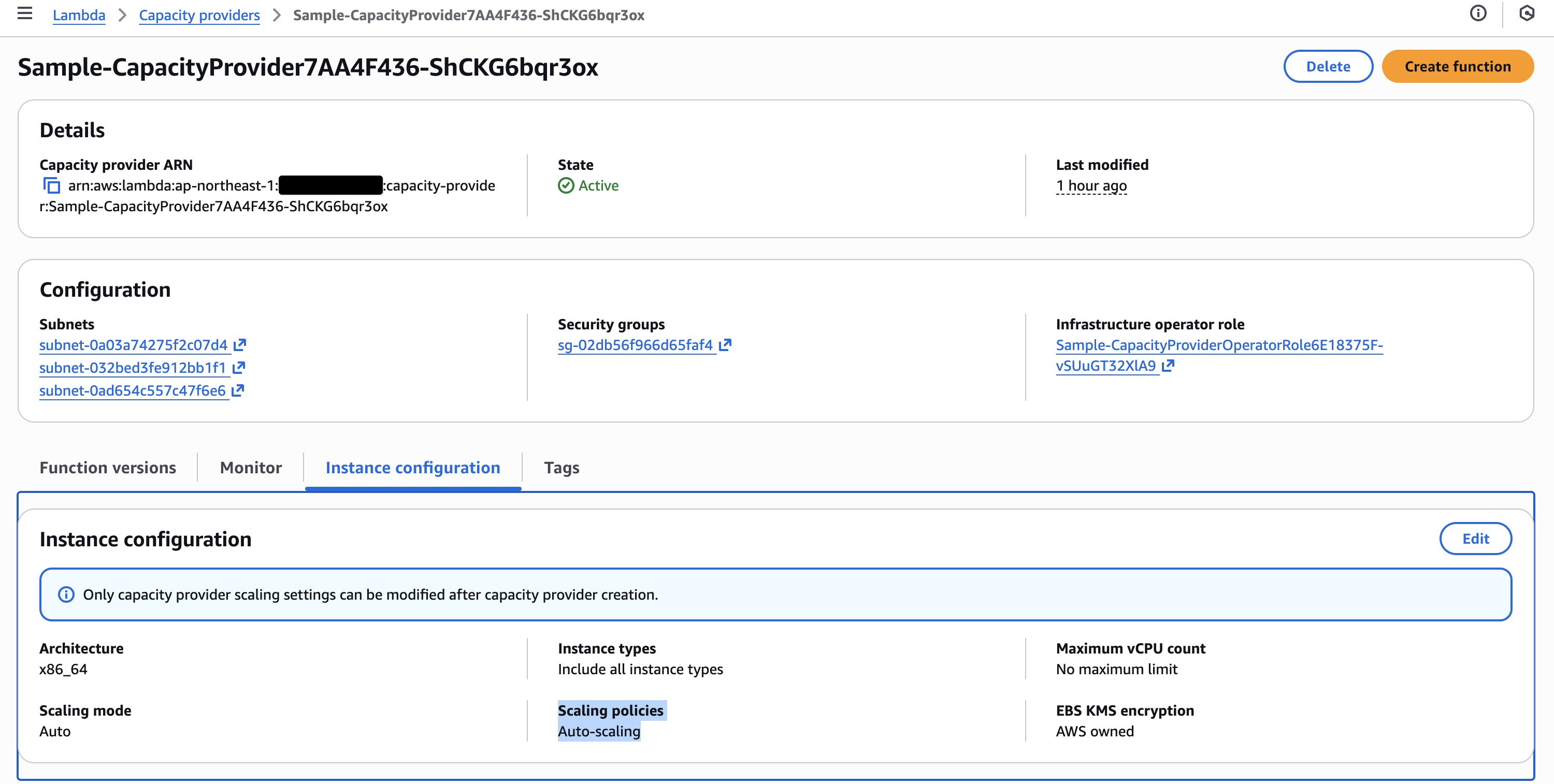今回は、前回確認できなかった部分でもある、AWS Lambda Managed Instances でデフォルト「自動スケーリング (Auto)」時の CPU 使用率に基づくスケーリングの挙動を確認してみました。