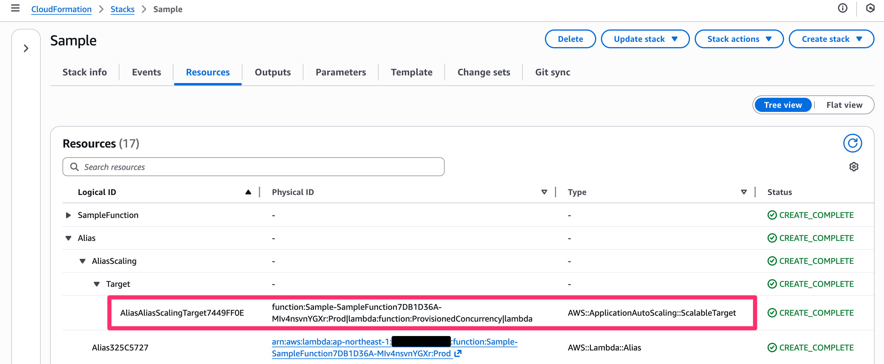 CloudFormation スタック上では Auto Scaling ターゲットのリソースが作成されているのを確認できます。