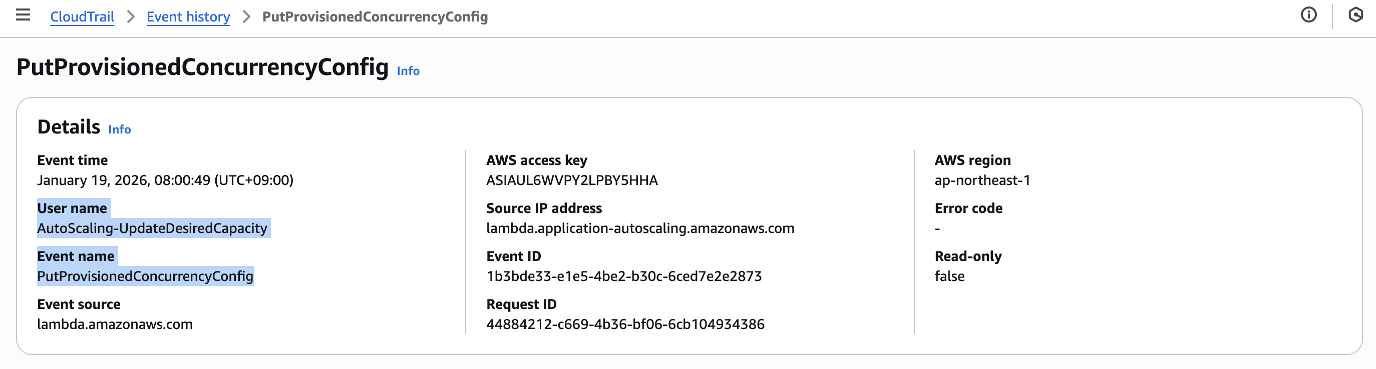CloudTrail でも、朝8時に Provisioned Concurrency が設定されるイベントが AutoScaling-UpdateDesiredCapacity というユーザー名で記録されていました。