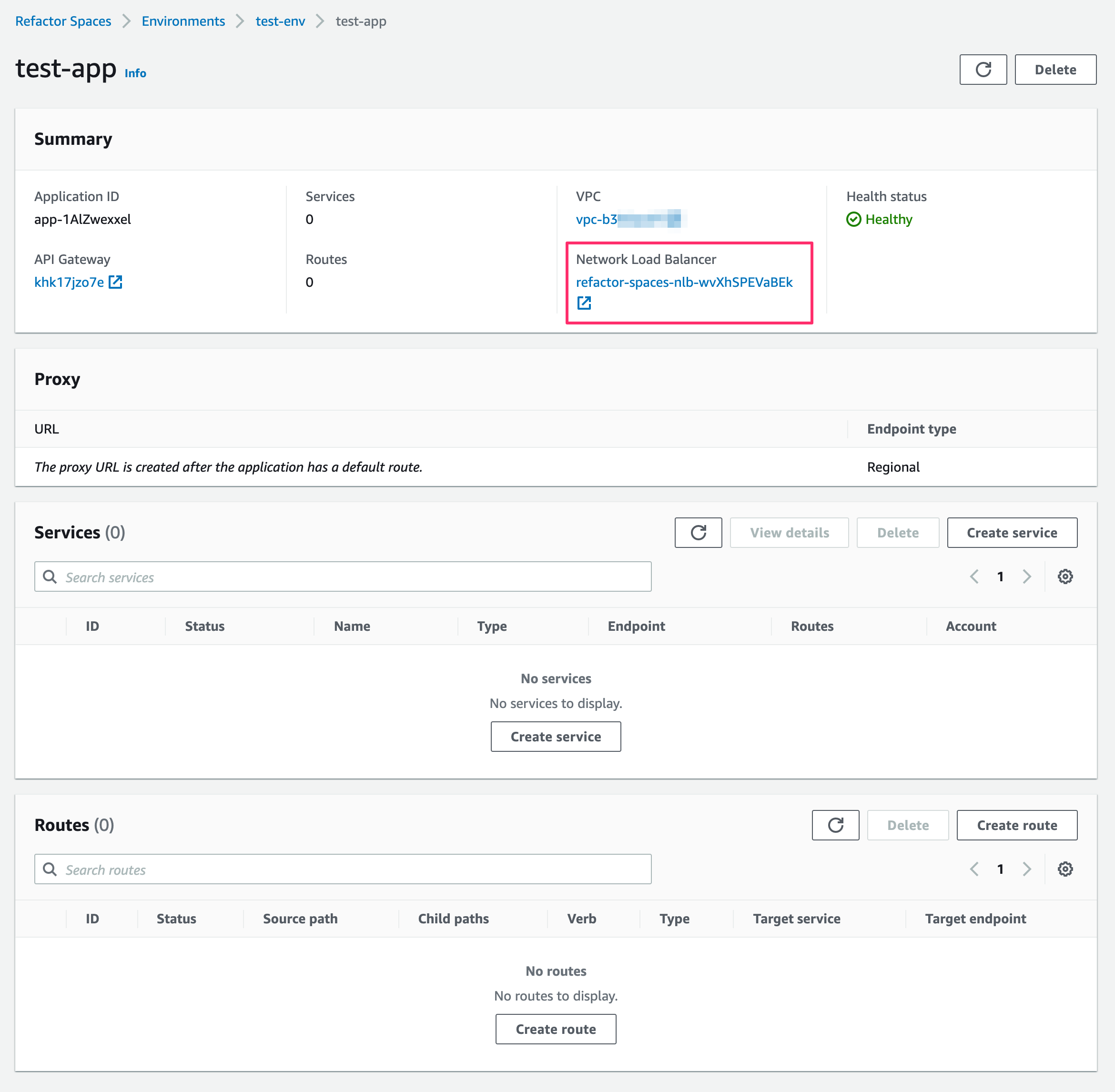 Applicationの詳細を確認すると指定したProxy VPC内にNetwork Load Balancerも自動的に作成されていることも確認できました。
