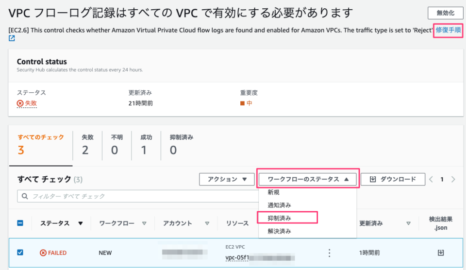 一通り無効化したら1つ1つ確認していきます。確認する場合は詳細画面上の「修復手順」でチェック内容と対応方法が確認できます。