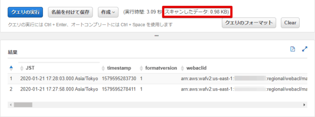 AWS WAF のログ検索に Athena を使用する際、パーティションを使ってスキャン対象のデータ量を絞ってみました。 今回は年・月でスキャン対象を絞りましたが、年・月・日で絞ることも可能です。