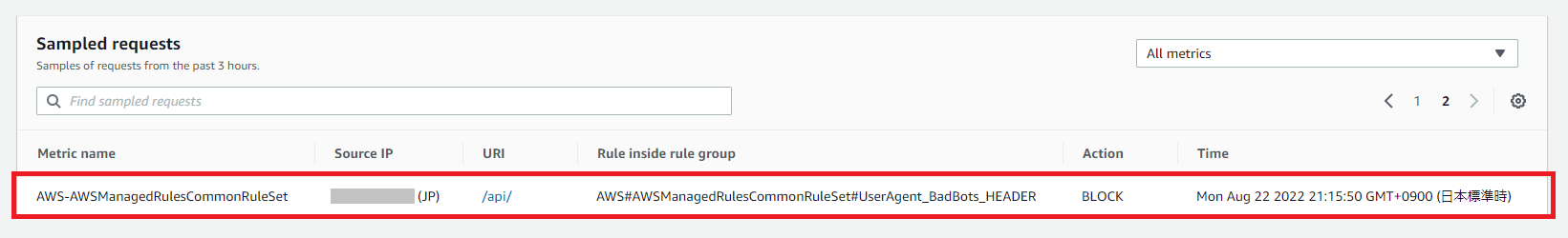 アクセスログ (AWS WAFのSampled requests) を確認してみましょう。