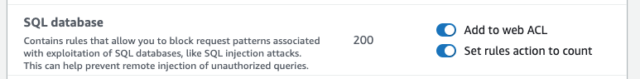 (Amazon Translateの直訳) SQL インジェクション攻撃など、SQL データベースの悪用に関連する要求パターンをブロックできるルールが含まれています。 これにより、不正なクエリのリモートインジェクションを防ぐことができます。