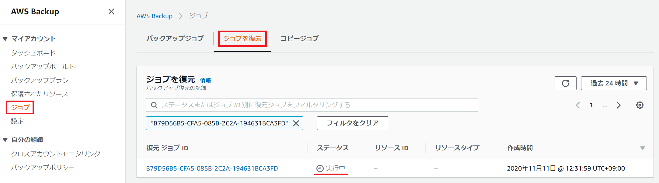 「ジョブ」の画面に遷移します。ステータスが「実行中」となりリストアが開始しました。