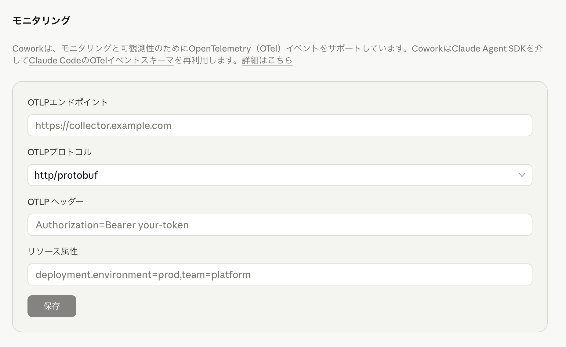Claude CoworkのEnterprise/Teamプランでは、OTelの送信先を組織管理画面から設定できます。