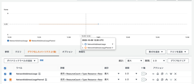 24時間単位でメトリクスが取得されます。リアルタイム性が求められるメトリクスではないかと思いますが、気にかけておかないとメトリクス取得やアラーム設定などで誤った判断をしてしまいそうです。(私はブログのために、ネットワークアドレス数を変化させて、結果を見たかったのですが、なかなか値が取得されず、待ちぼうけしてしまいました。。)