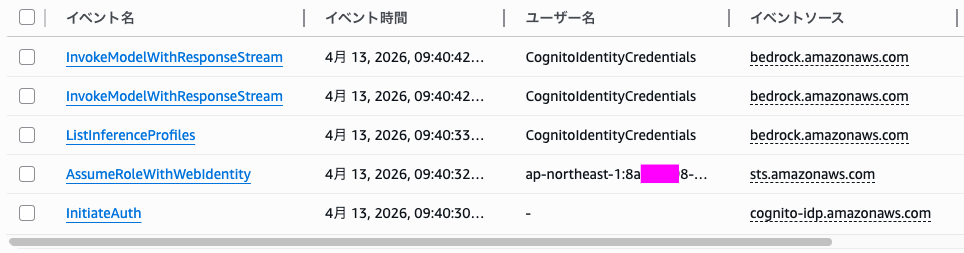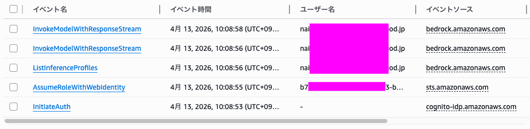 Bedrock の操作(3, 4)のユーザー名が一律 CognitoIdentityCredentials です。ログだけでは誰の操作か特定できません。