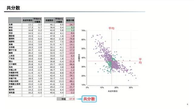 今回の例でいうと民営の借家の割合と未婚の割合の相関係数は0.723と高いが、だからといって民営の借家を増やすと未婚の割合が増える、民営の借家を減らすと未婚の割合が減るという関係があるわけではないことは常識的に考えても明らかだろう。