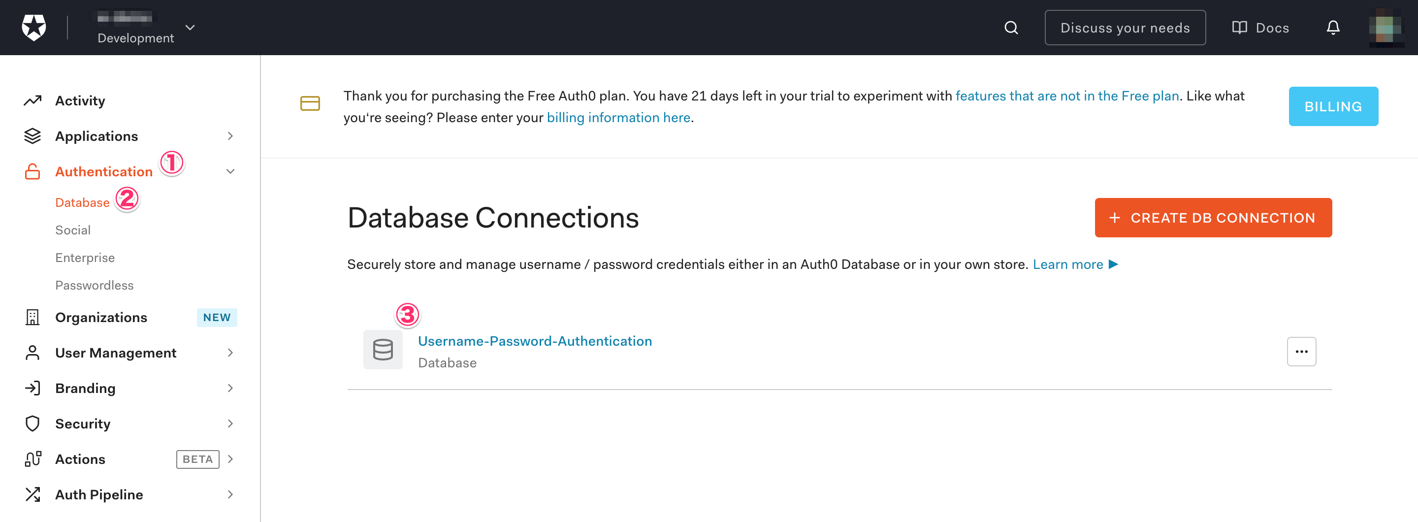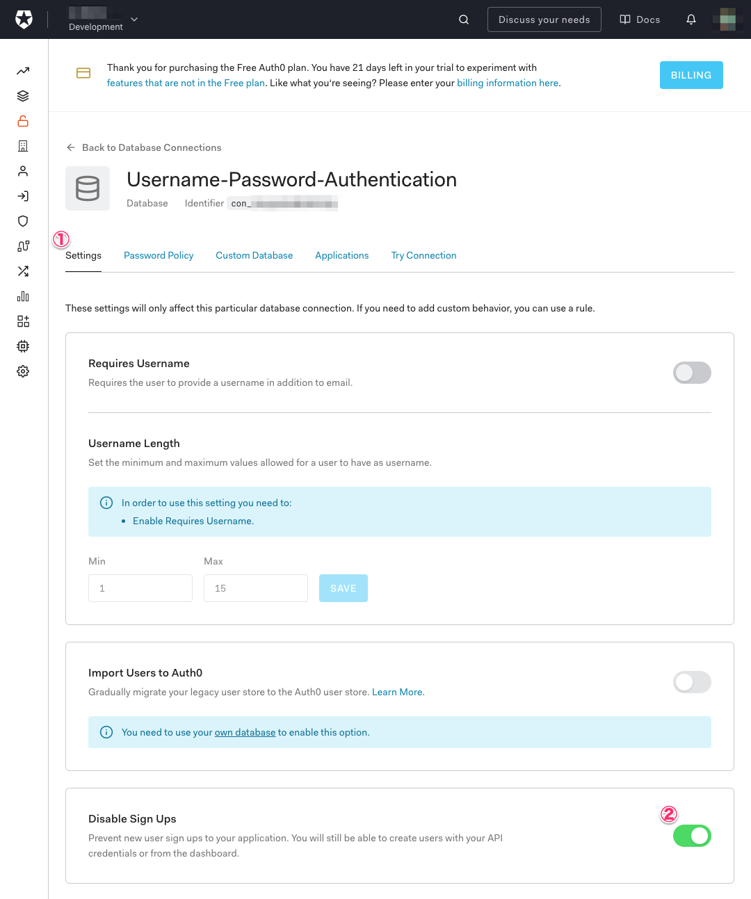 Auth0管理コンソールで[Authentication]-[Database]を開き、サインアップを無効化したいデータベースを選択します。