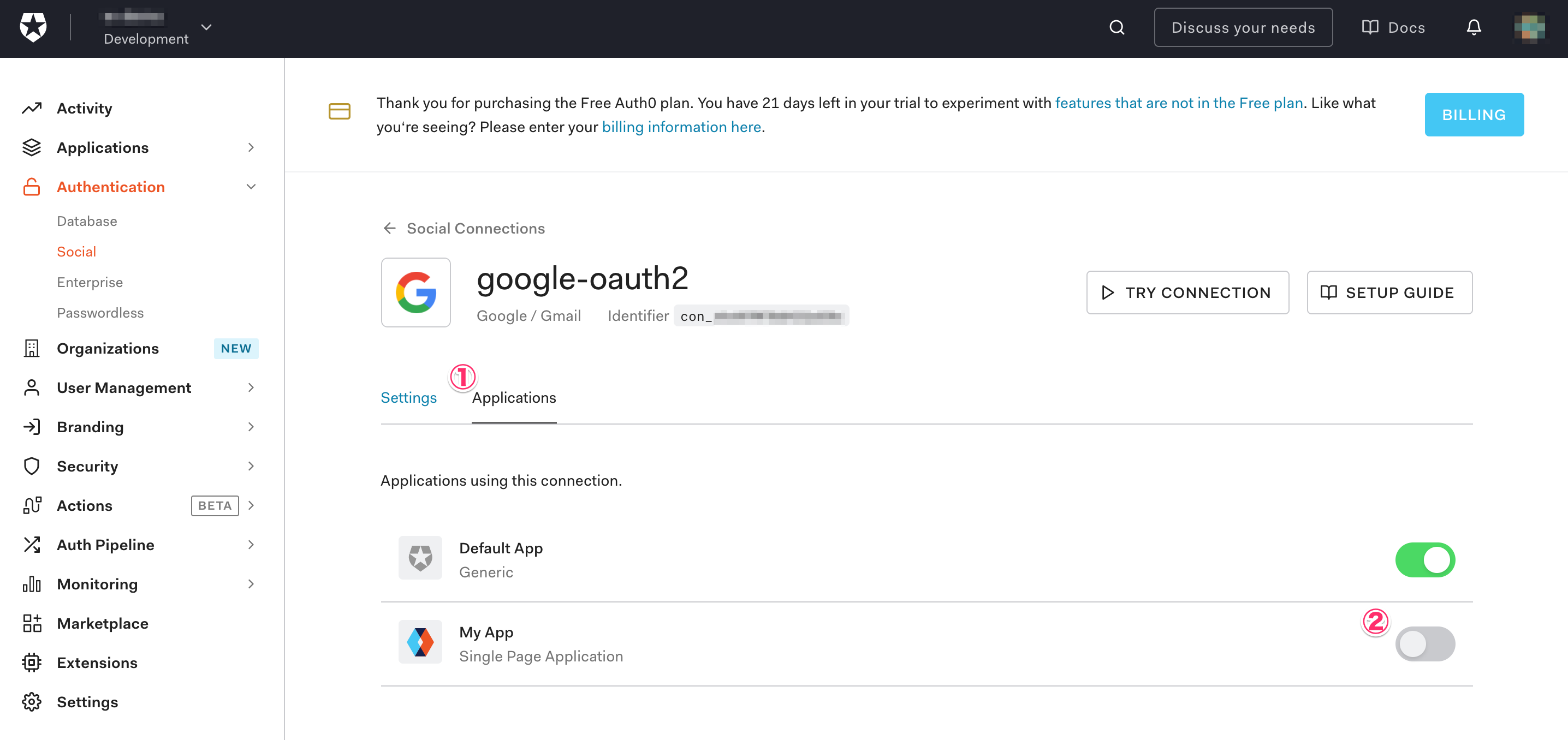 [Applications]タブのページでソーシャルログインを無効化したいアプリのconnectionをオフにします。