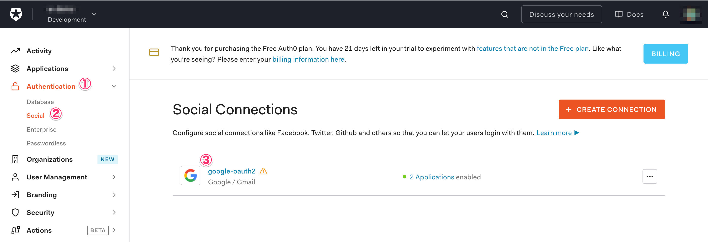 Auth0管理コンソールで[Authentication]-[Social]を開き、google-oauth2を選択します。