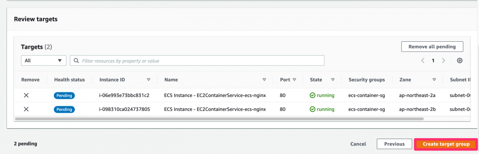 클러스터 생성을 통해 만들어진 EC2 인스턴스 2개를 추가하고 타겟 그룹 생성을 끝마칩니다.